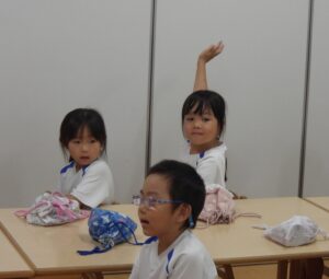いっきくんのお父さんからは、流しそうめんには竹を使うこと、そして、その竹は『孟宗竹』という名前、そして、タケノコの写真を見ながらタケノコの節の数のことや、一日にどれだけ大きくなるかということを教えてもらいました。タケノコが一日に何センチ伸びるかというクイズでは、120センチ伸びることもある、と聞いてみんなびっくりしていました。