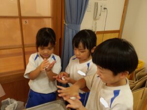 その後は、待ちに待った流しそうめん。流れてくるそうめんを箸で掴むのがなかなか難しい様子でしたが、口に運ぶことができると「おいしい~!」と笑顔一杯の子どもたちでした。