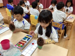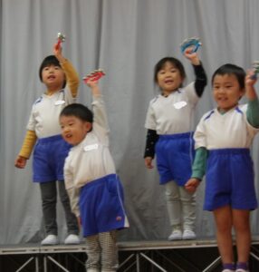 カスタネットと鈴の音を楽しみながら、楽器を鳴らしているぱんだ組のお友だち。カスタネットと鈴の持ち方や鳴らし方を確認した後に、「どんぐりころころ」の曲に合わせて演奏会をしました。「タン・ウン・タン・ウン・タンタンタン・ウン」のリズムを口ずさみながら楽器を鳴らしている子もおり、とても上手でしたよ!