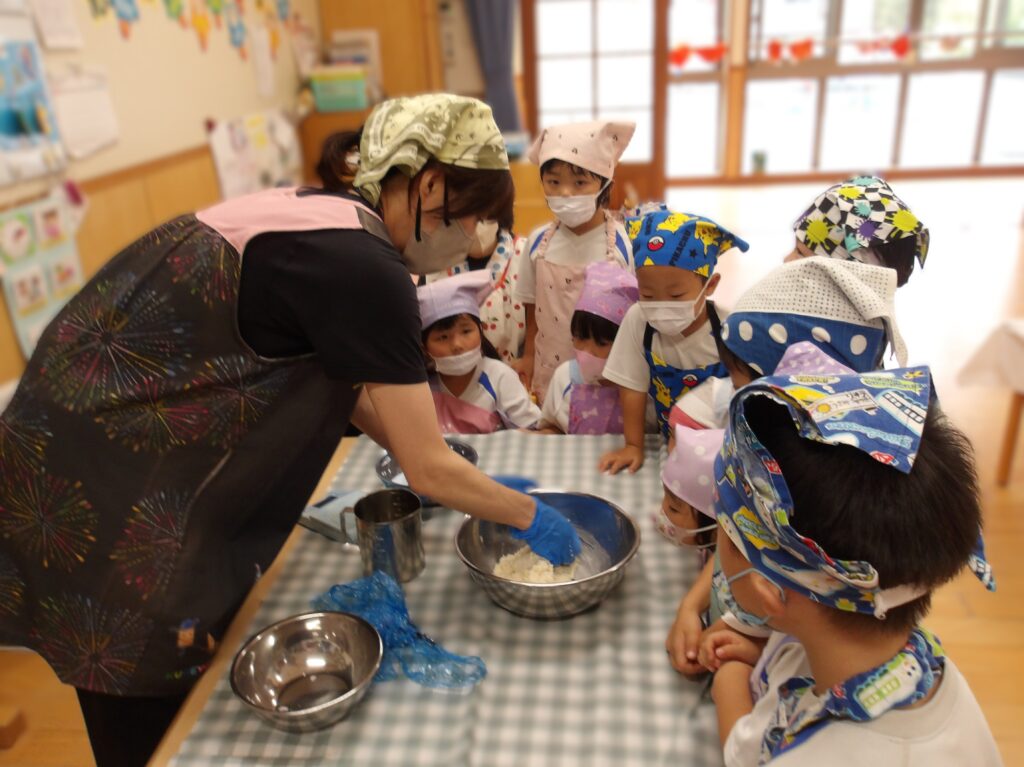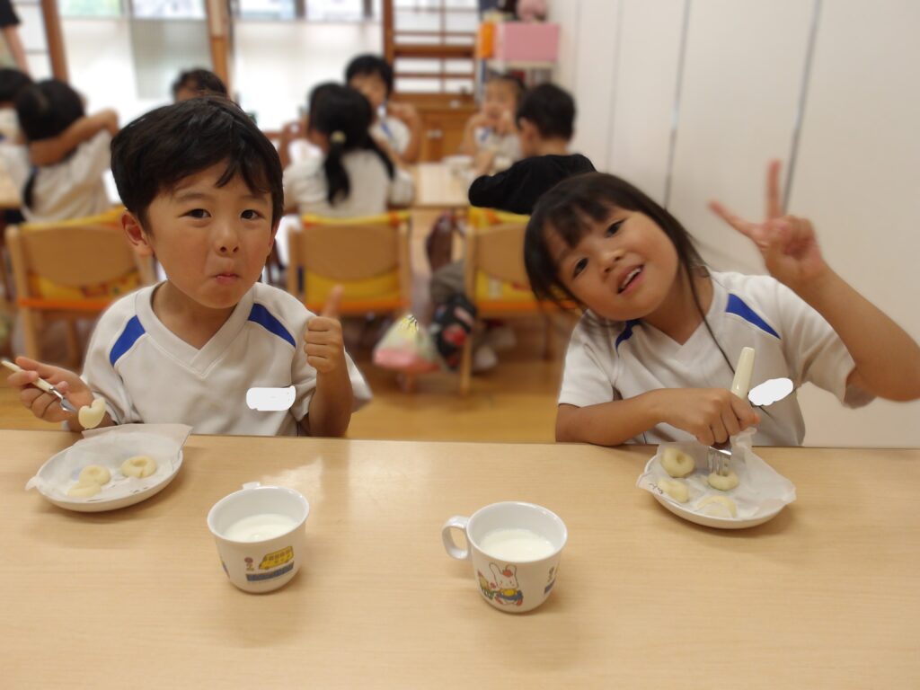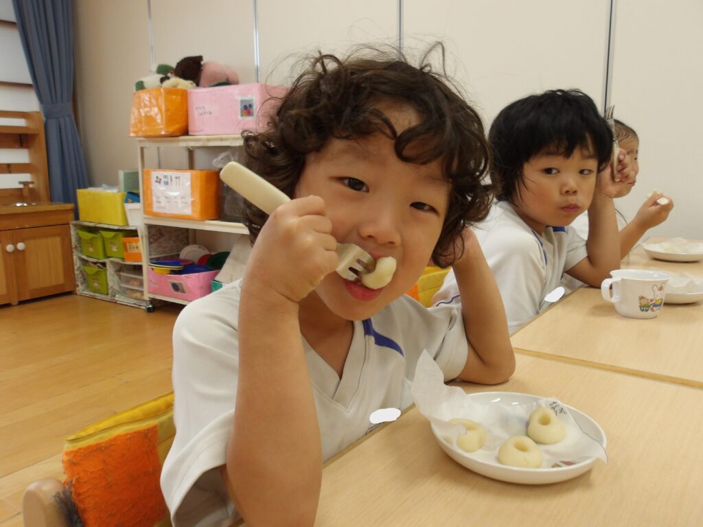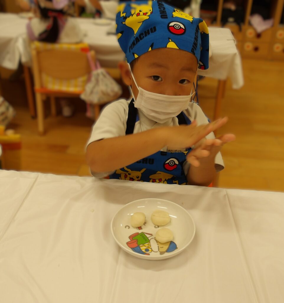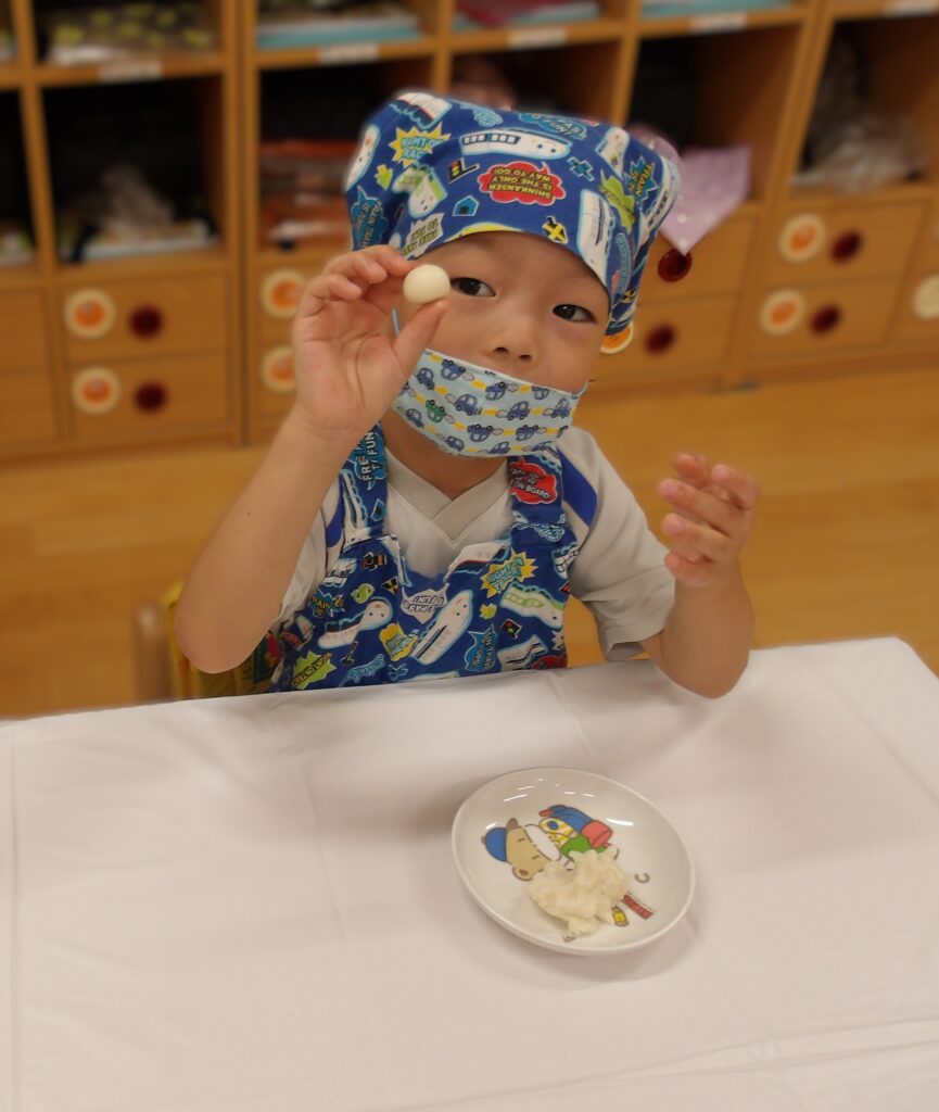 お団子作りでは、練習を活かして上手に丸めていた子どもたち。上新粉、白玉粉、砂糖が混ざってまとまっていく様子を見ながら匂いを嗅ぎ、「いい匂い!」と話していました。作ったお団子はおやつでいただきました。「自分で作ったお団子はおいしいね!」と食べる姿が見られました。