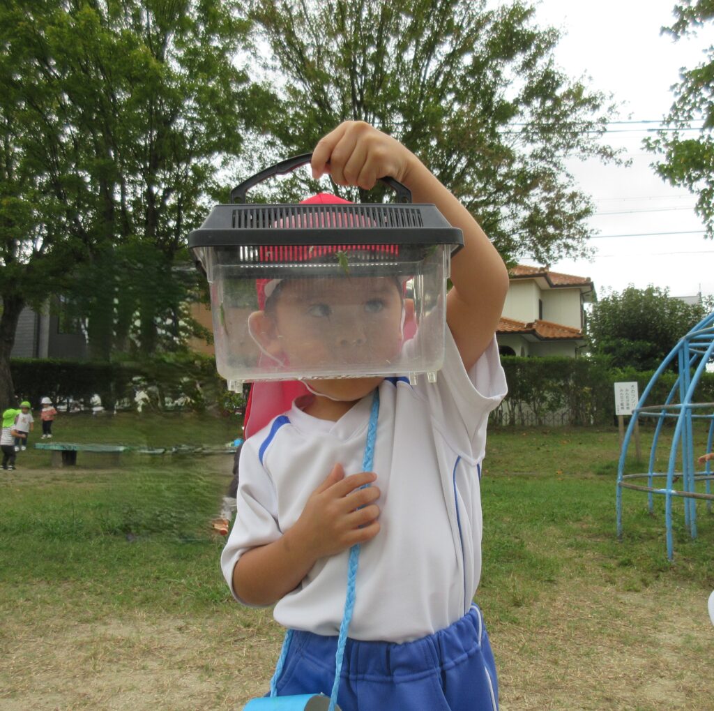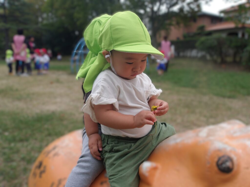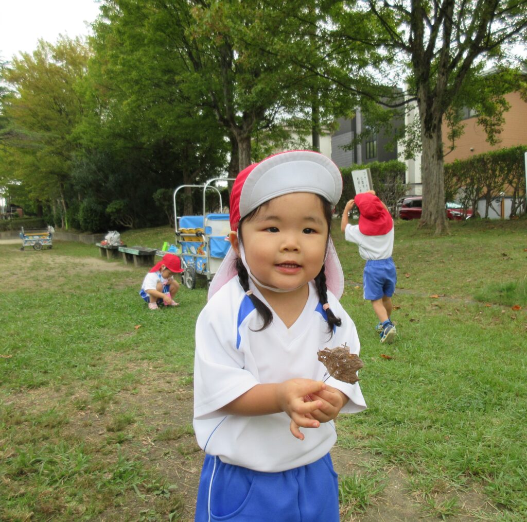 ひよこ、うさぎ組さんは平池公園に出掛けましたよ。秋の自然物や虫に触れたり、好きな遊具を見つけたりして楽しむことができました。