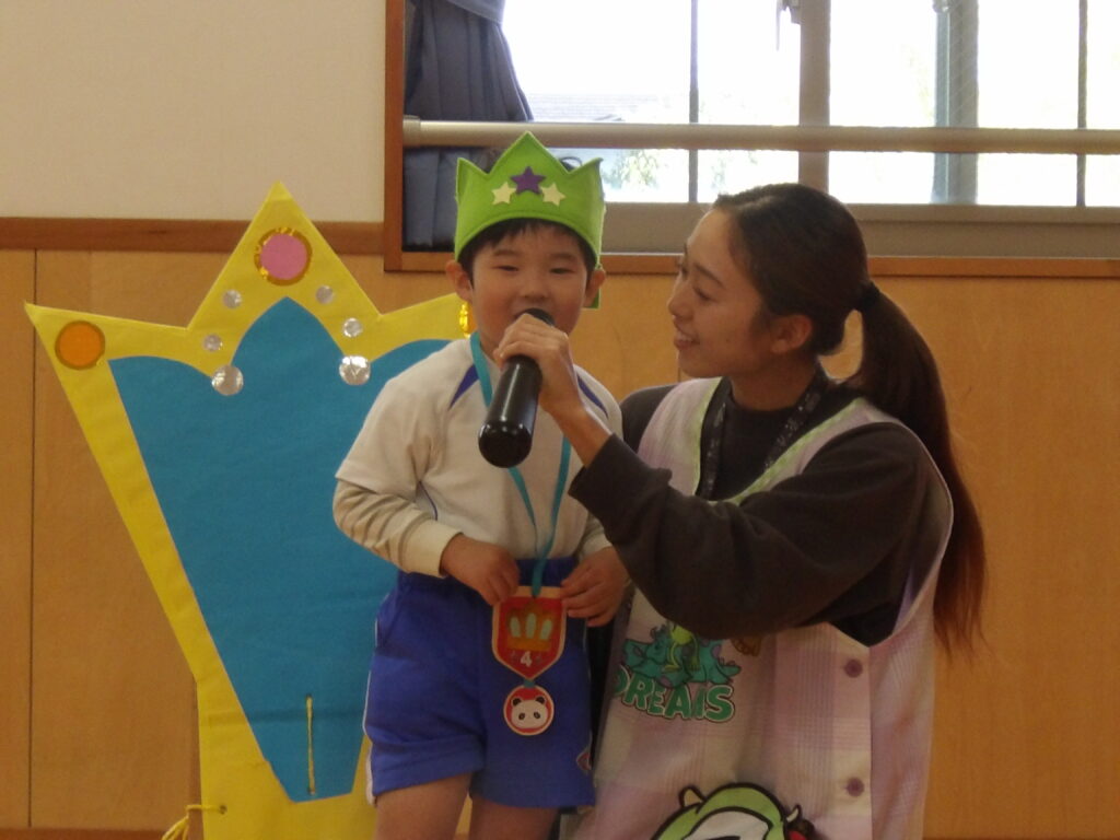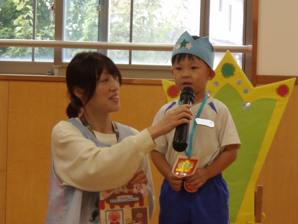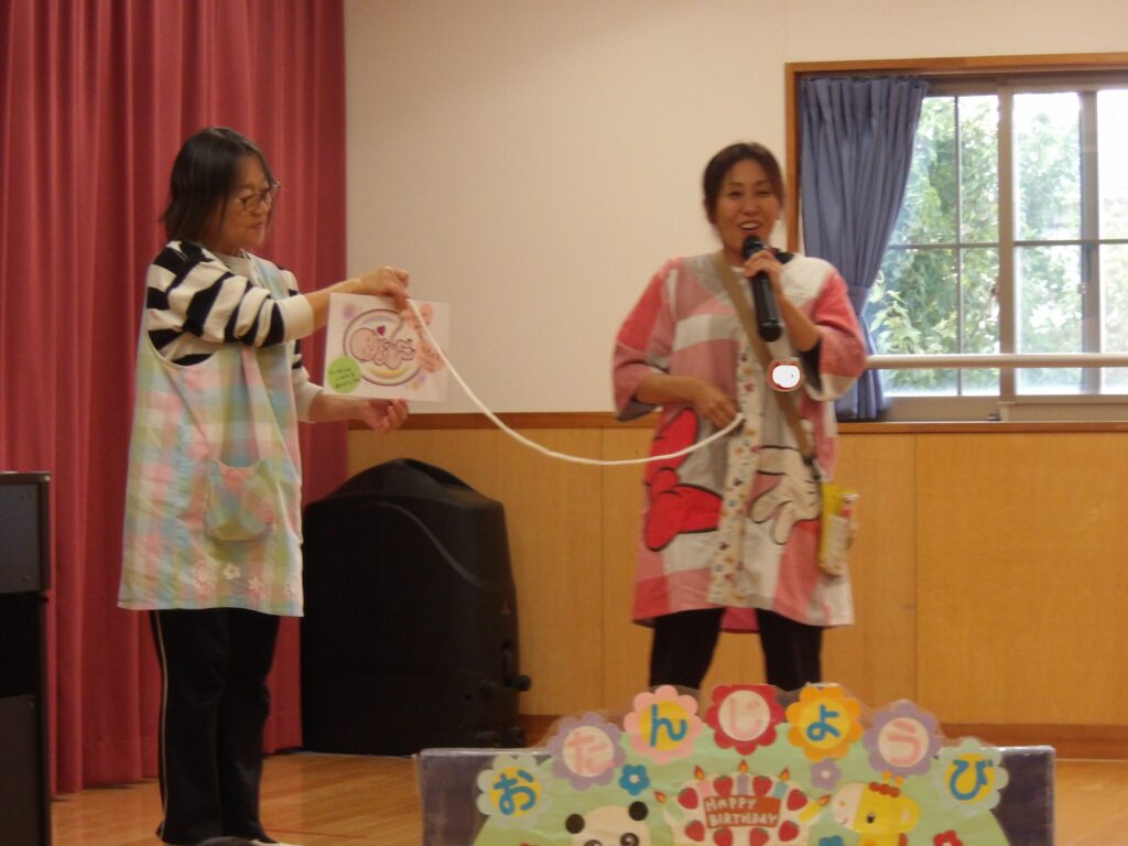 また、早番として勤務してくださっていた熊谷先生が、10月末でやしろ保育園を卒園されることになり、誕生会で挨拶をしてくださいました。子どもたちの成長を見守り、たくさん遊んでくださった熊谷先生、ありがとうございました。