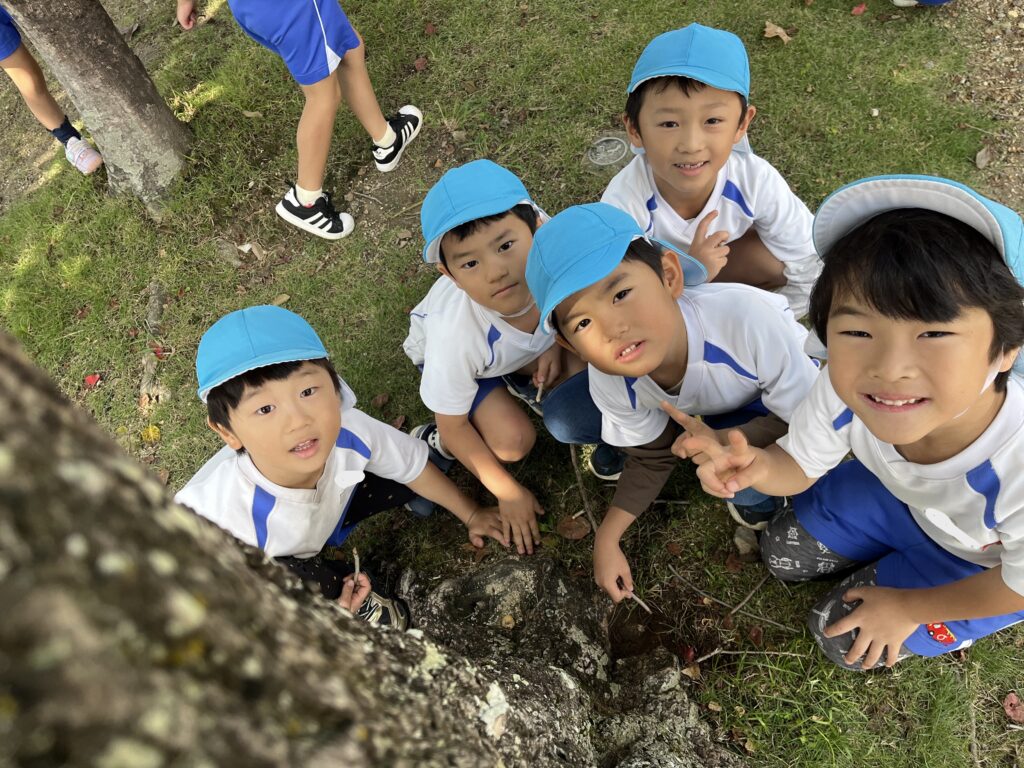 どんぐりや栗、色づいた葉っぱを嬉しそうに保育者に見せてくれたり、虫を見つけて観察したり、捕まえたりしています。