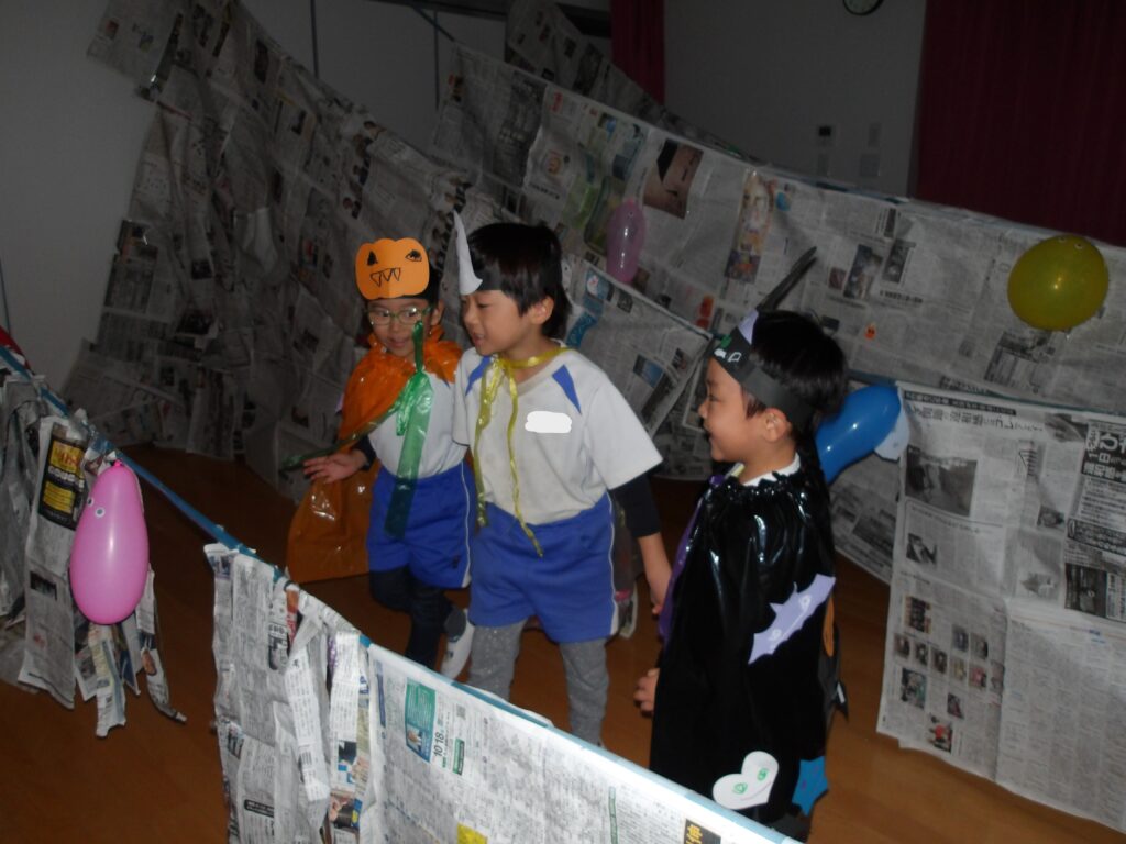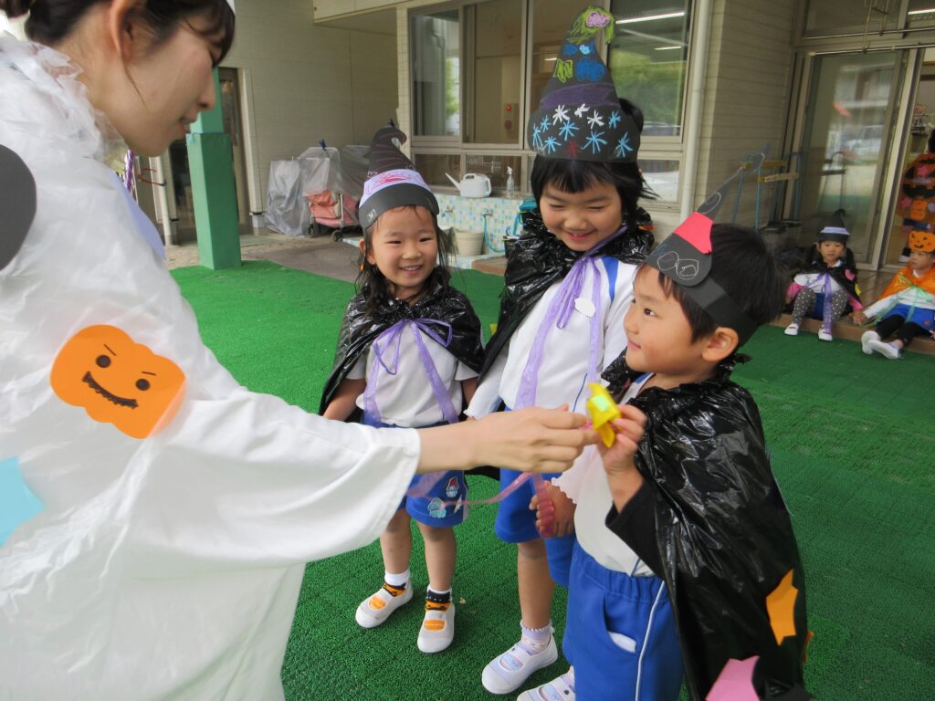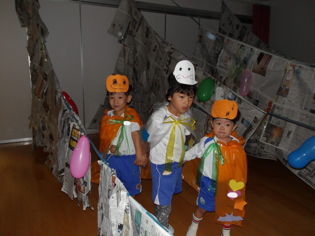 ひよこ組、うさぎ組さんは各クラスで迷路を回りました。園長先生からは、かわいいおばけのカードをもらって、笑顔を見せる姿が見られましたよ。