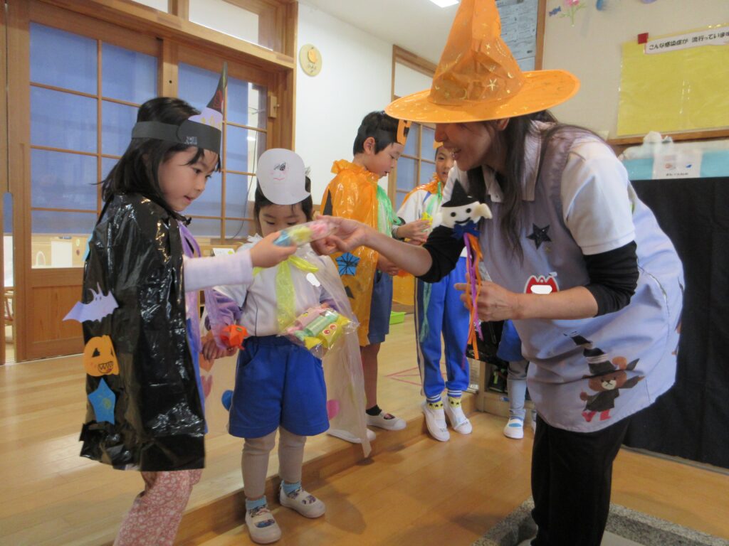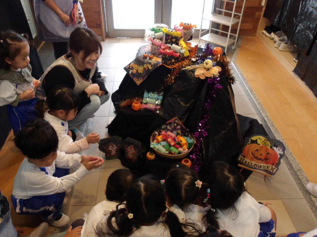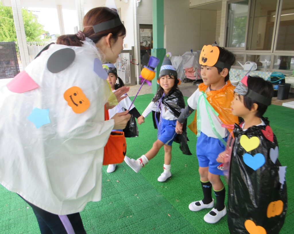 当日は、自分たちが作ったお面とマントを付けて、3学年のグループで迷路を回りました。迷路には、秘密のメッセージが隠されていて、それをおばけに変身した保育士に伝えると、折り紙でできた「ジャック・オー・ランタン」のプレゼント!その後は園長先生が待っている玄関に向かい、「トリックオアトリート!」と言うと、かわいいキャンディーがもらえて、喜んでいた子どもたち。また、園長先生が飾りつけしてくださった玄関がとても素敵で、「すごーい!」と驚く声も聞かれましたよ。