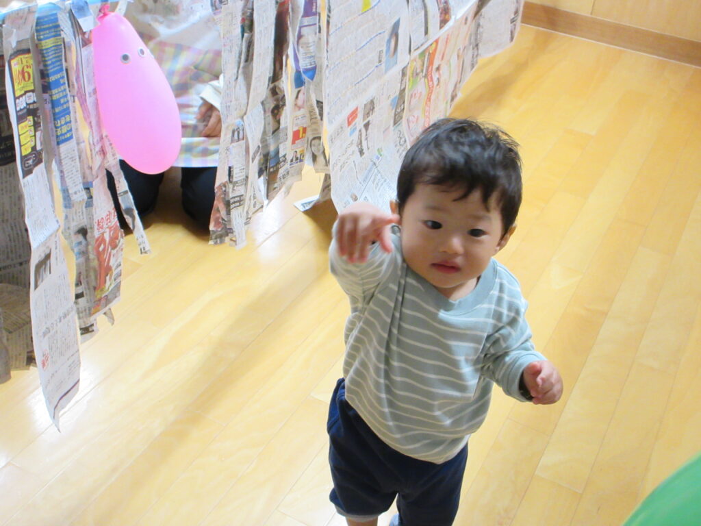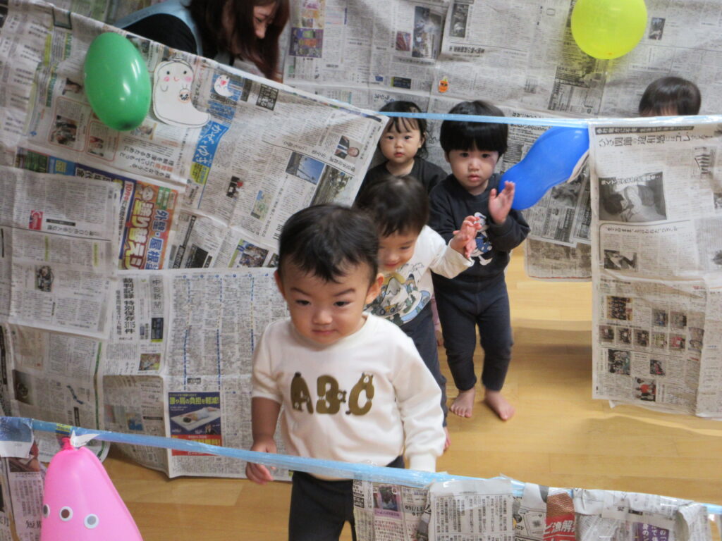 3歳以上児さんが合同保育でお面やマントを用意し、きりん組、ぱんだ組さんが遊戯室に迷路を作ってくれましたよ。