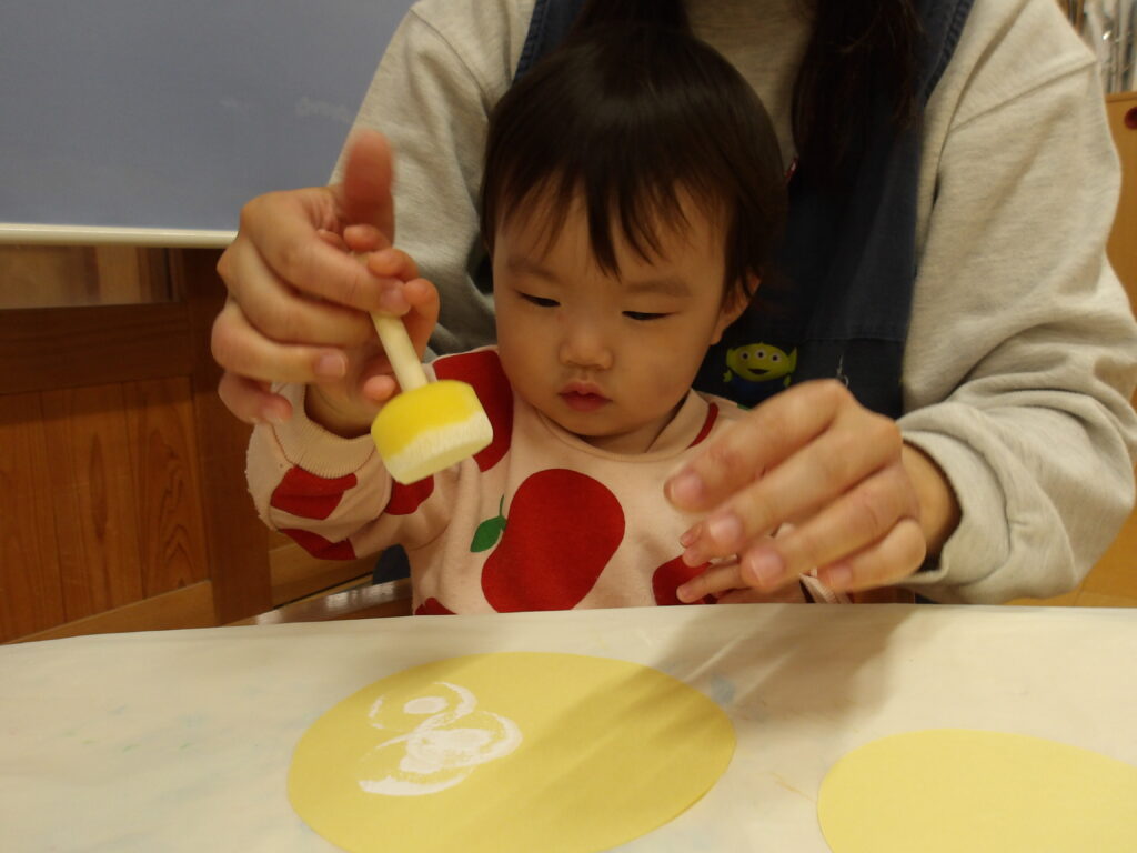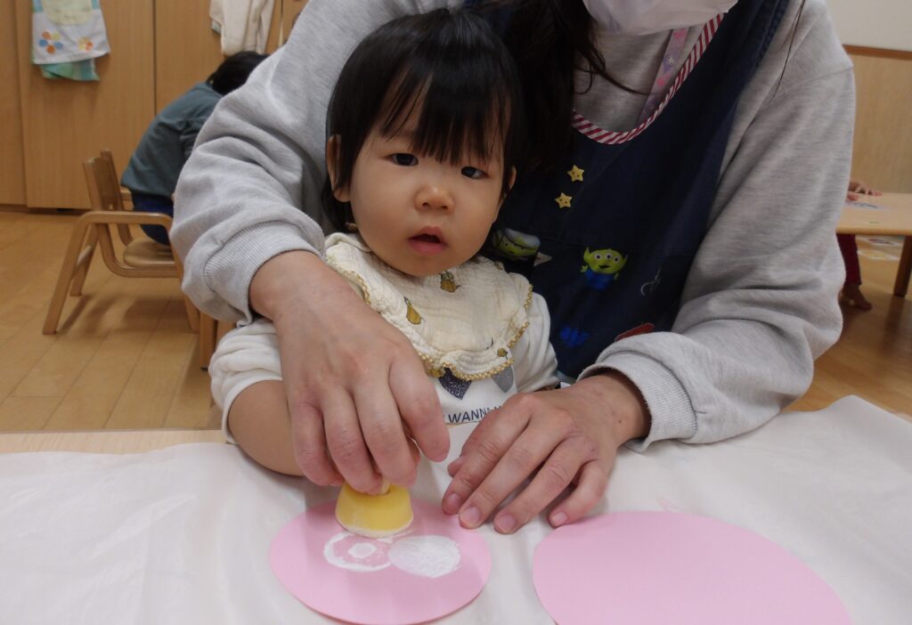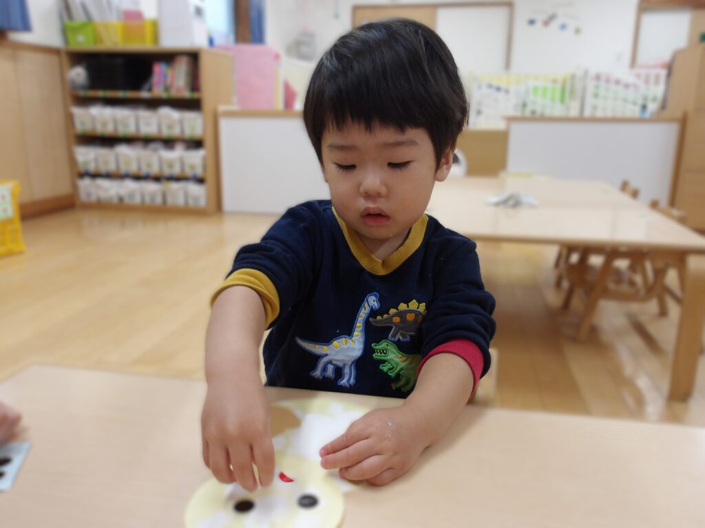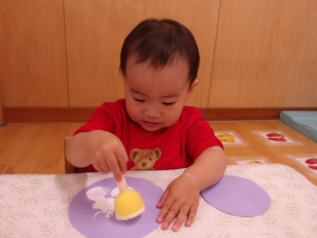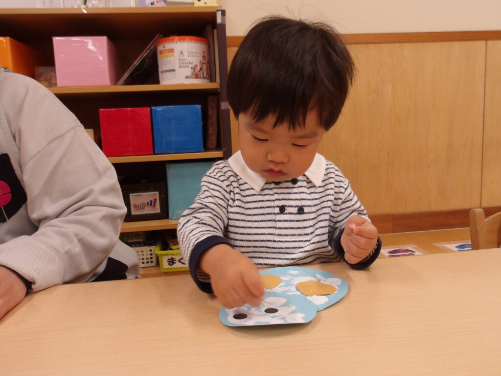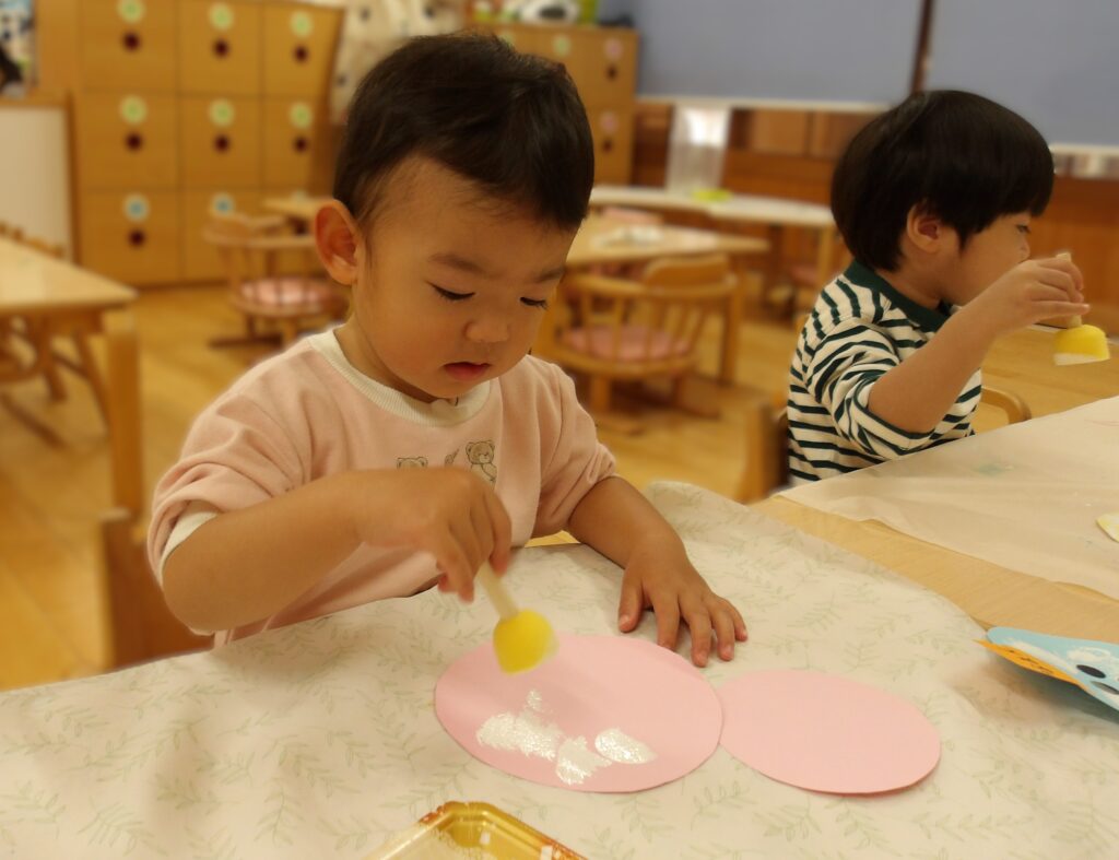 スポンジスタンプで雪を表現しましたよ。1歳児さんはのりを使って、雪だるまを貼り付けることに初めて挑戦!のりがついていない面をつけようとしてしまい、「あれ~?」と不思議そうにしながら集中して行う姿が微笑ましかったです。