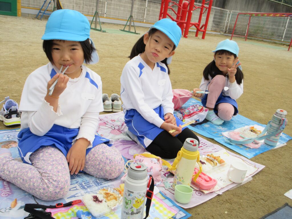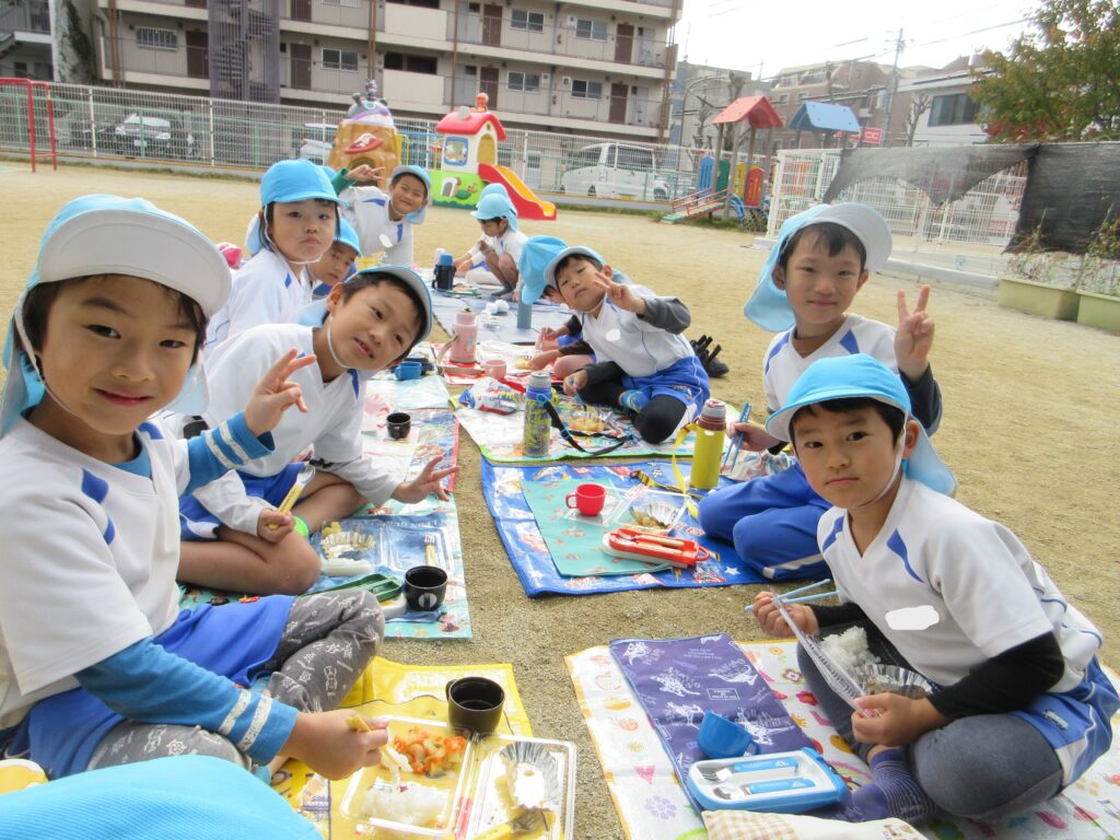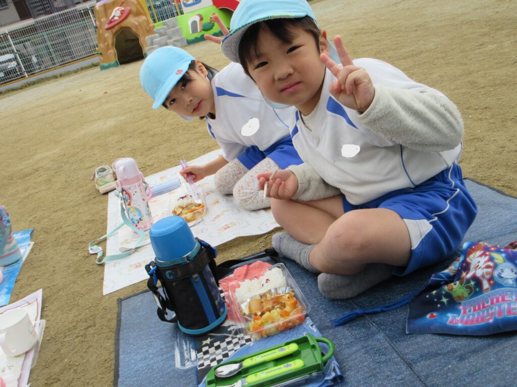 給食室の先生が特別に給食をお弁当にしてくれ、家から敷物を持ってきてみんなで食べましたよ。苦手な野菜も、雰囲気を変えてみんなで食べるとおいしく感じ、とても嬉しそうでした。午前中には散歩に出かけていたこともあり、「遠足みたい」「なんだか特別だね」と会話も弾みましたよ。