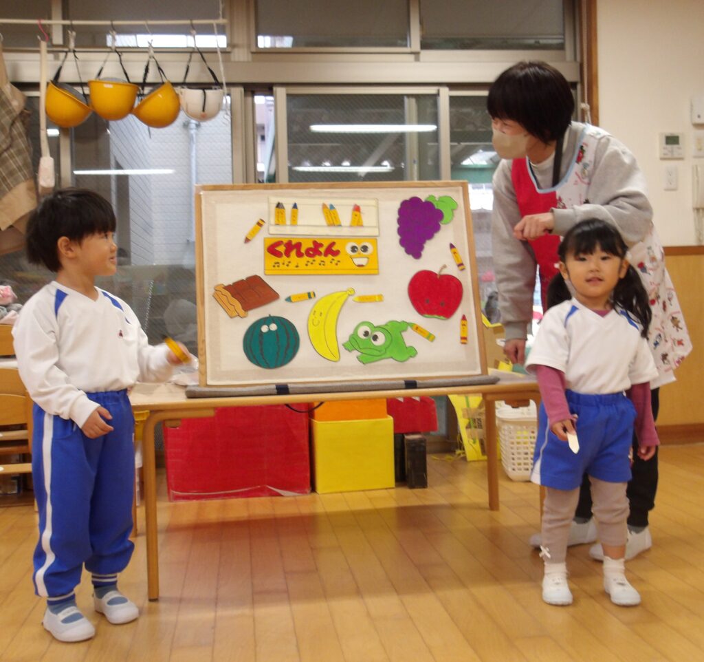 1つ目は「花咲き山」という絵本のお話から、優しいことをすると花咲き山が咲くということです。「優しいことって何だろう?」と聞かれると、「転んだ子を心配してあげる」「困っていたら、お手伝いをする」など子どもたちが答えてくれました。花咲き山にお友だちの花がたくさん咲いたら素敵だなと思いました。
