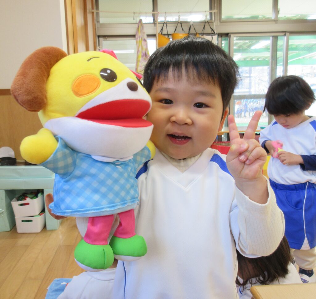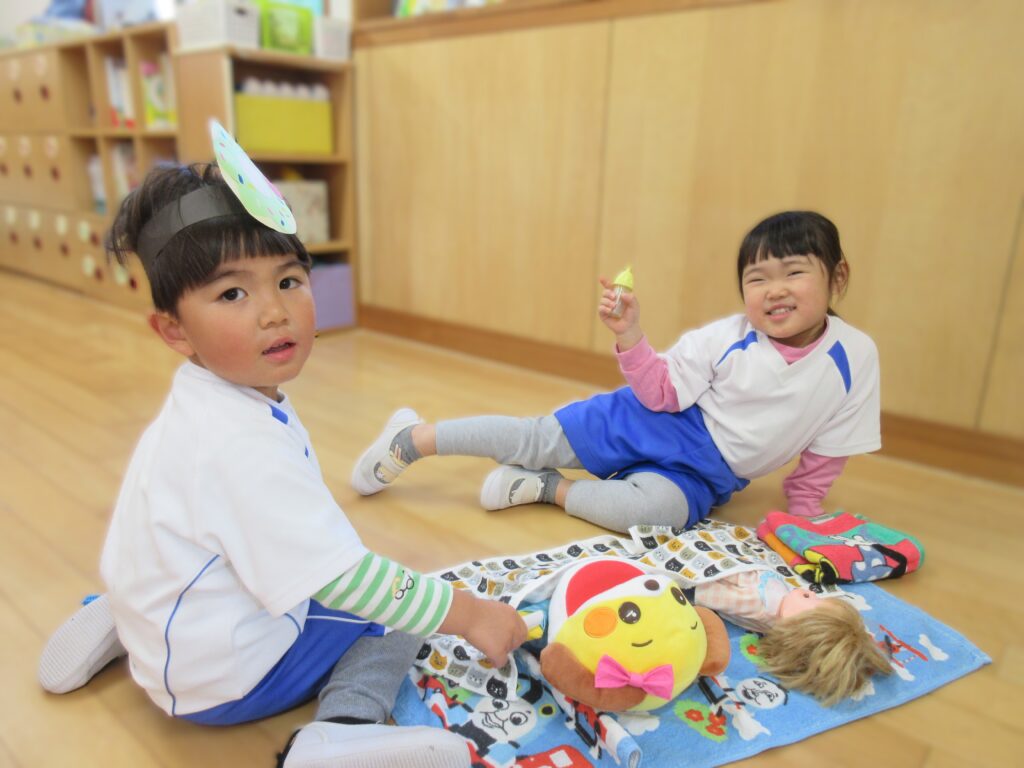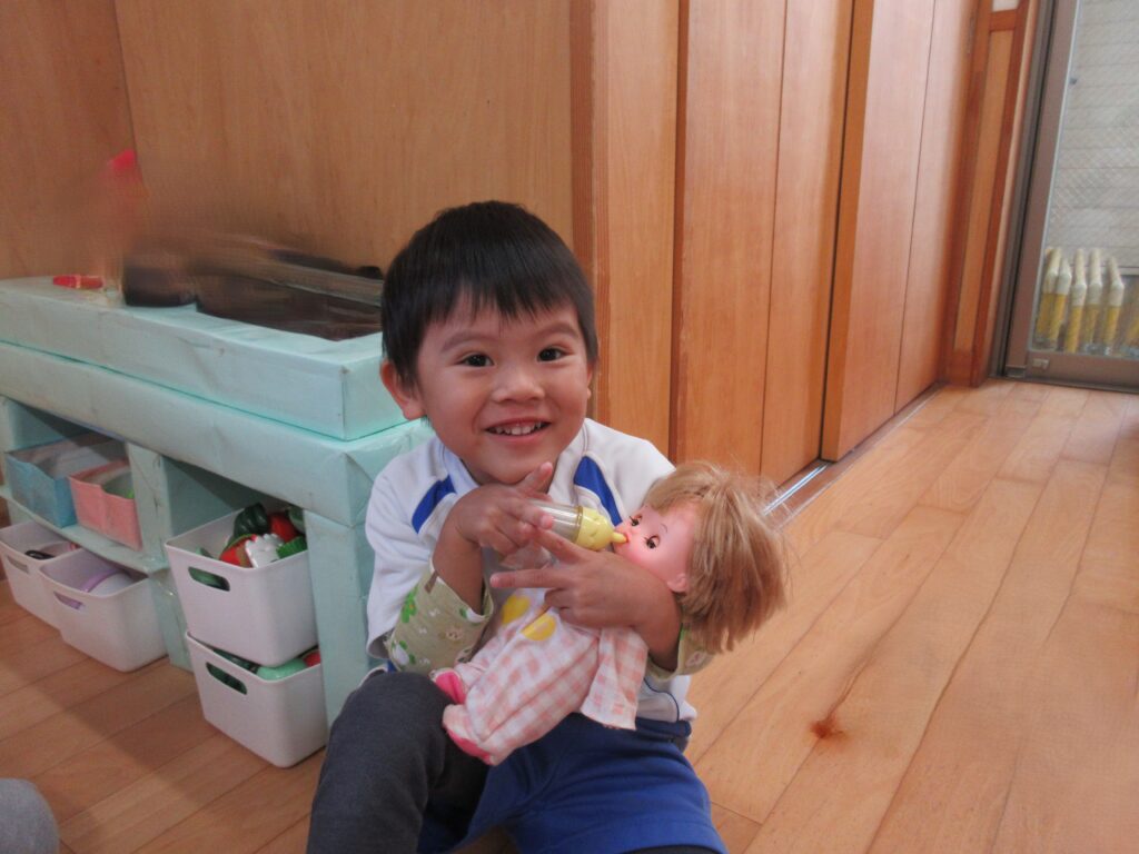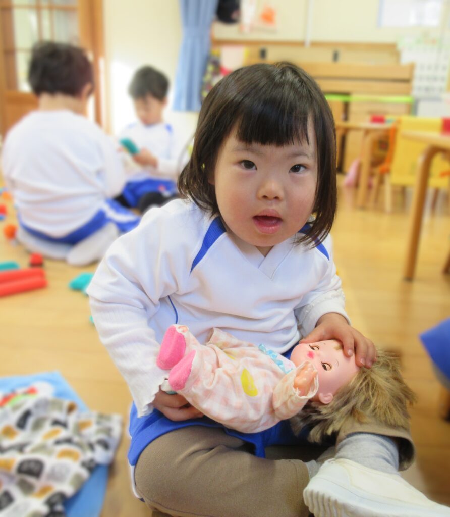 うさぎ組さんでは、お人形やぬいぐるみのお世話が人気で、ミルクをあげたり、トントンをして寝かしつけてあげたりと楽しんでいますよ。