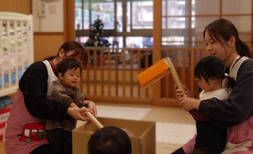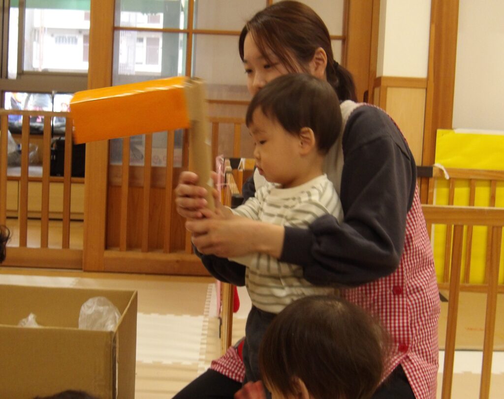 ひよこ組さんは、お部屋でおもちつきごっこを楽しんでいました。