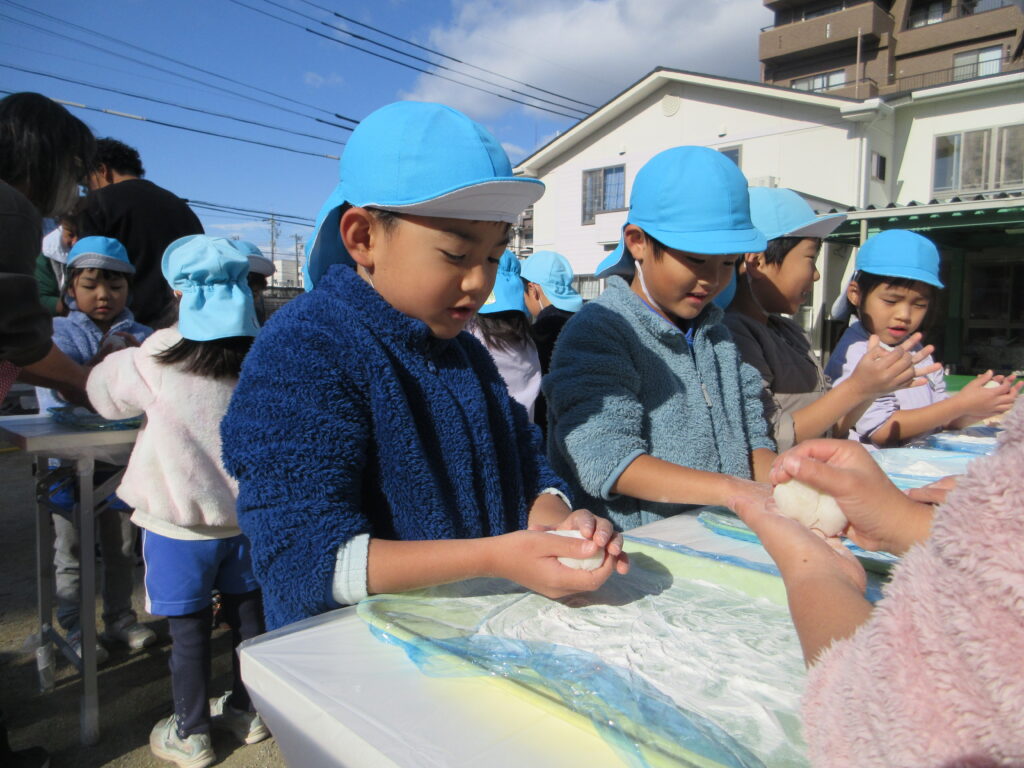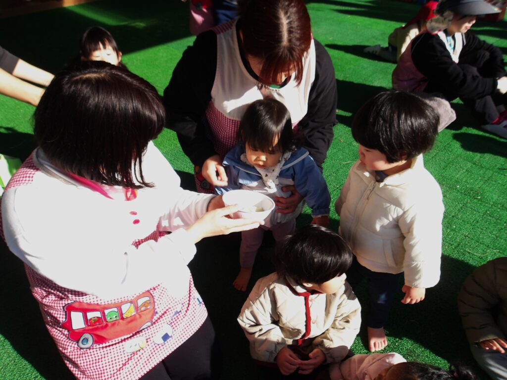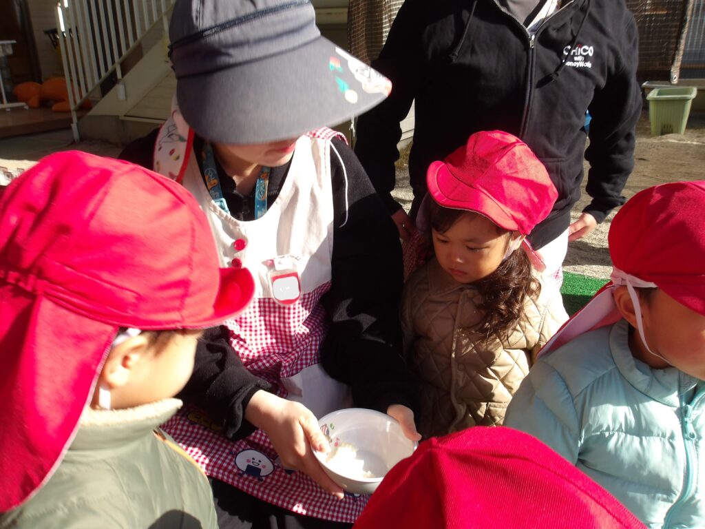 蒸し上がったもち米は、3歳以上児さんで試食し、「モチモチするね」「おいしい!」という声が上がりました。その後は、いよいよらいおん組さんのおもちつき。子どもたちが「よいしょ~!よいしょ~!」と元気な声で応援してくれ、らいおん組さんも張り切ってお餅をついていましたよ。