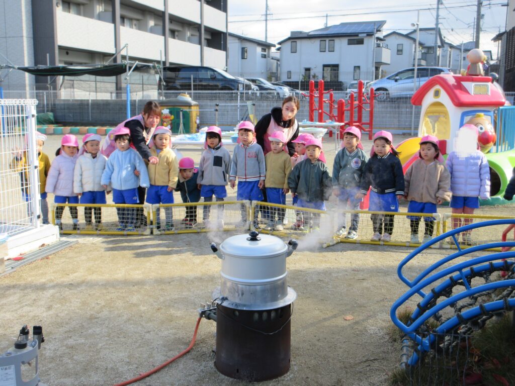 園庭でもち米が蒸し上がる様子を観察していた子どもたちからは、「いい匂いがしてきた!」「楽しみだね!」と期待の声が聞かれましたよ。