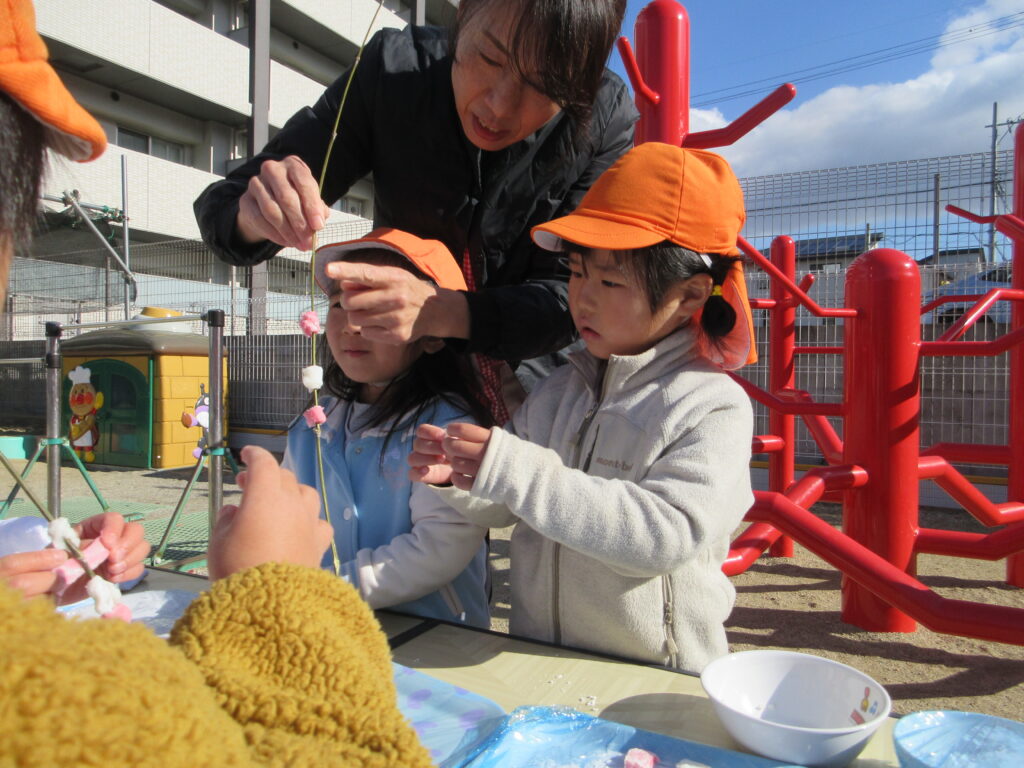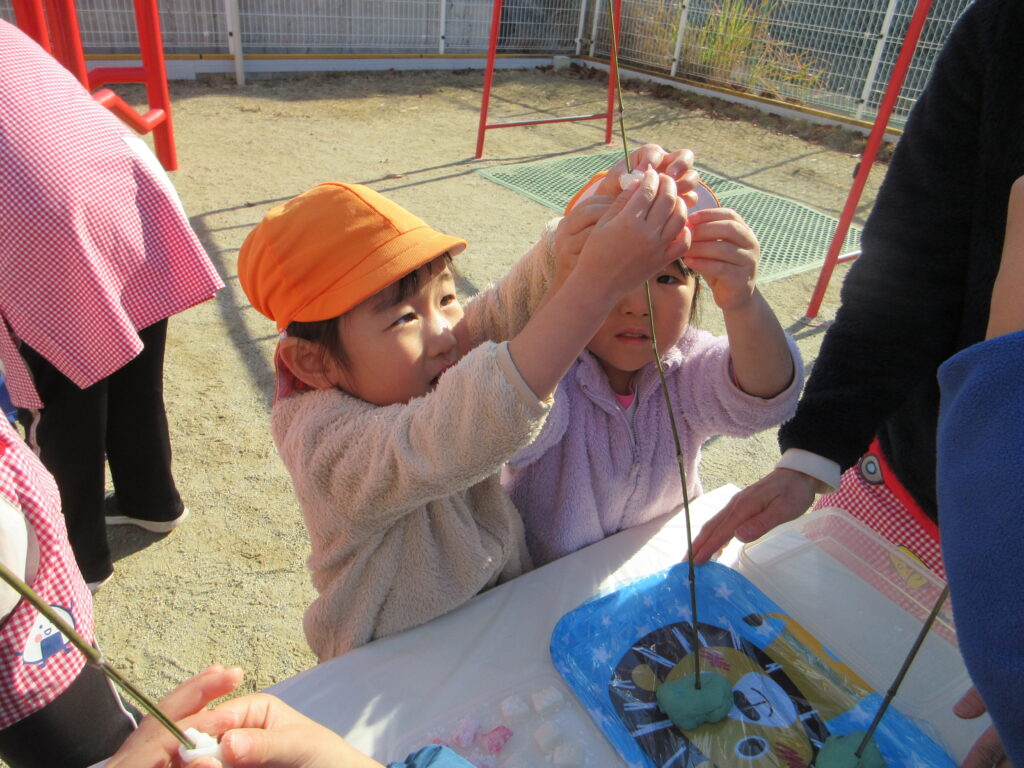 もちつきの後はらいおん組さんが鏡餅、きりん組さんが花餅づくりをしてくれました。