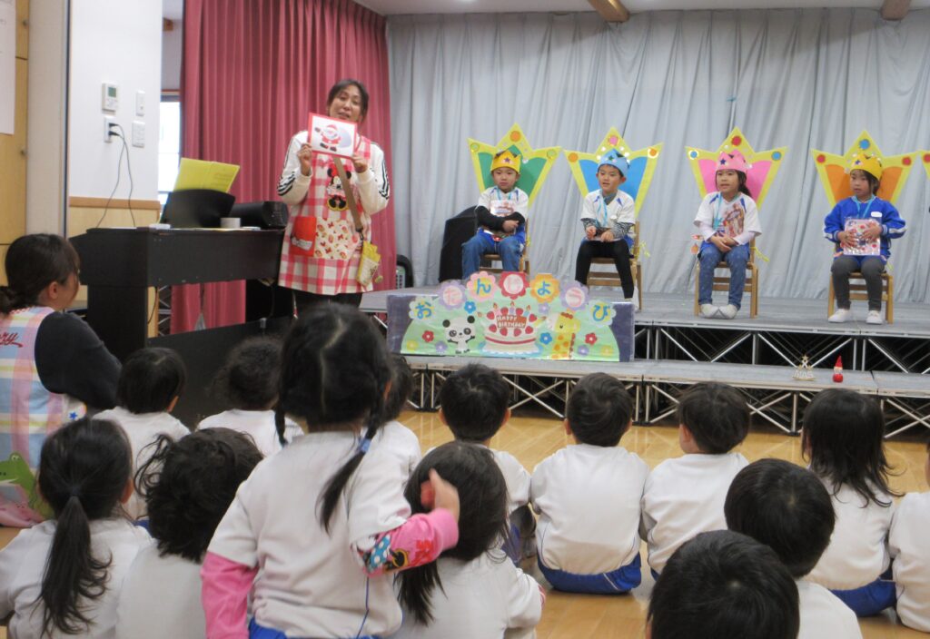 園長先生からは2つお話をしていただきました。まず、1つ目はサンタさんについてです。サンタさんは世界中の人たちが幸せになれるように願っている人で、みんなが一生懸命頑張っていたり、人に優しくでき、思いやりの心が持てていると嬉しいということを教えていただきました。「明日のクリスマス会にサンタさんが来てくれるかな?」と楽しみにしている様子が見られましたよ。