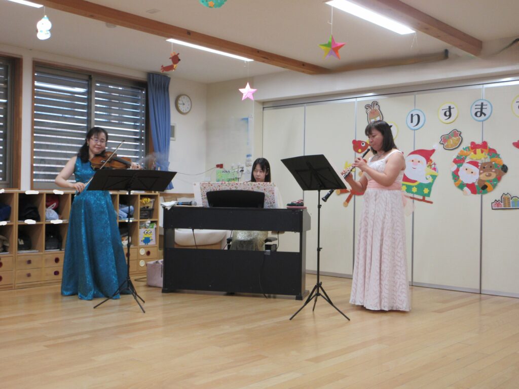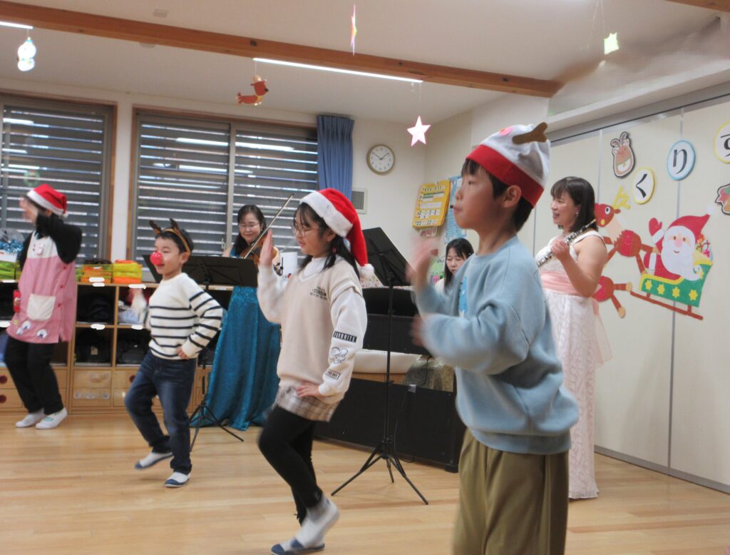 卒園児の保護者お二人と、在園児の保護者お一人によるクリスマスミニコンサートでは、子どもたちも知っているクリスマスソングを演奏していただき、手拍子をしたり、身体を揺らしたりしながら楽しみましたよ。また、卒園児のお友だちも演奏中に鈴やウッドブロックを鳴らしてくれたり、「ジャンボリーミッキー」の曲では、前で一緒に踊ってくれたりしてくれました!