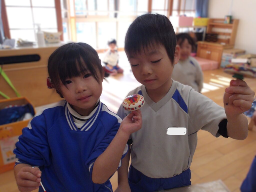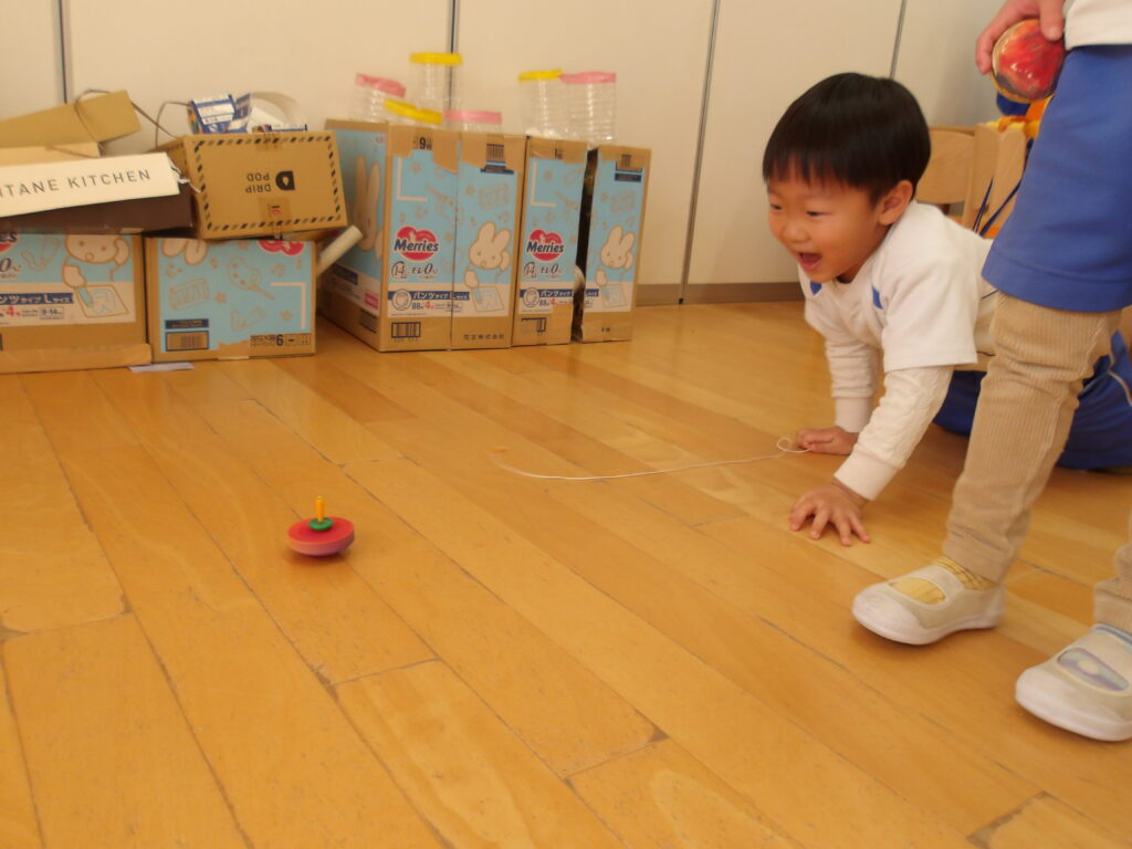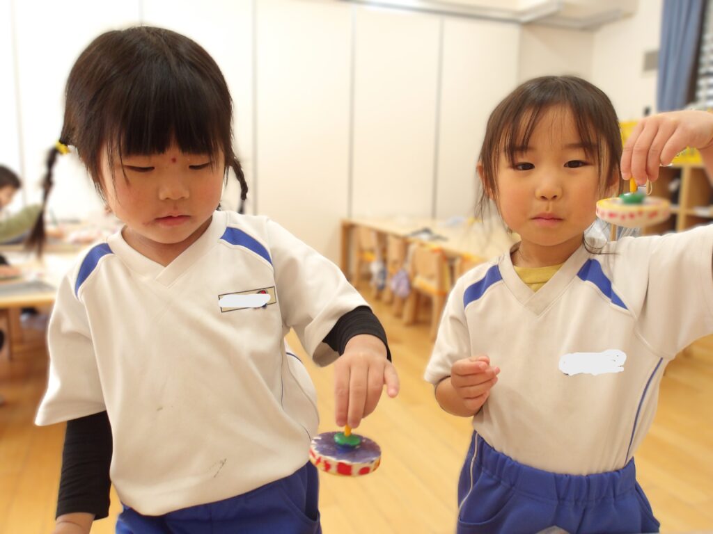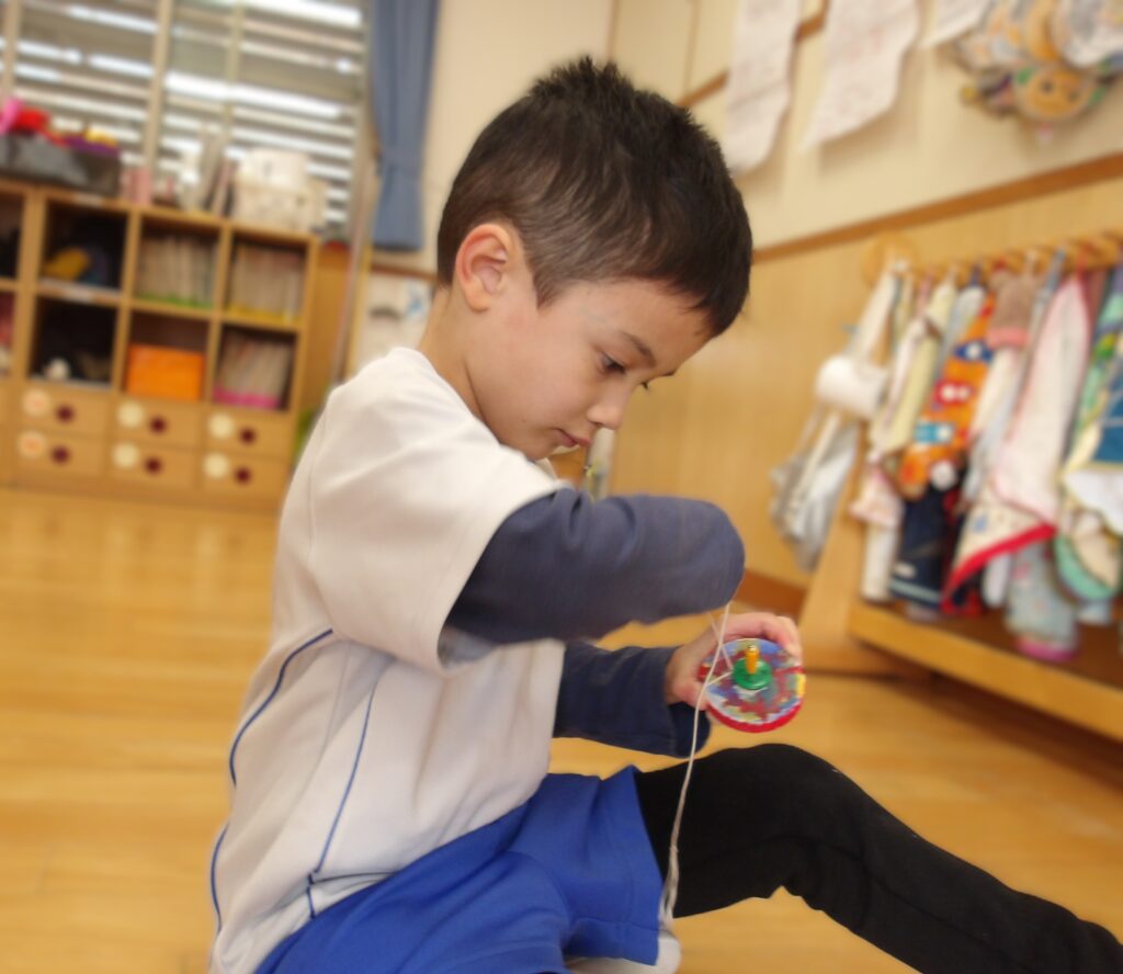 紐を一生懸命に巻いて、コマを回すことも楽しんでいます。傘回しができるようになった子もいて、たくさん回せるように挑戦していますよ。