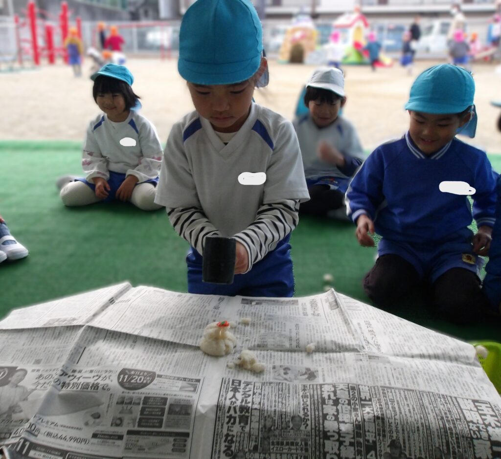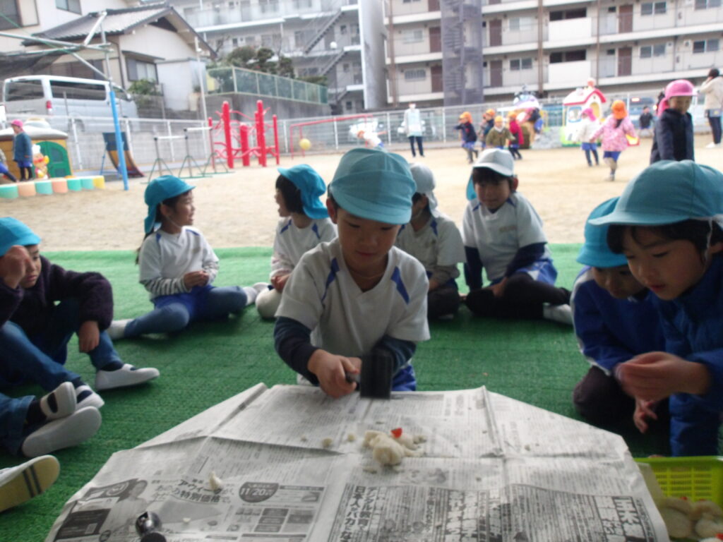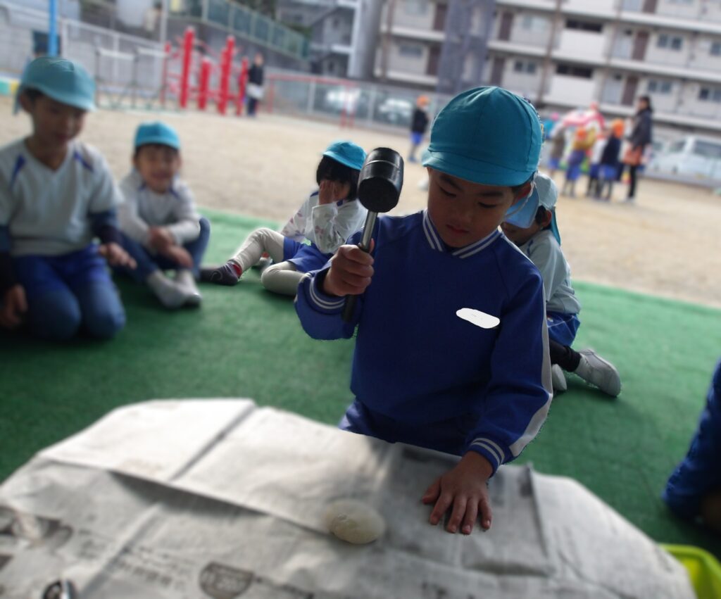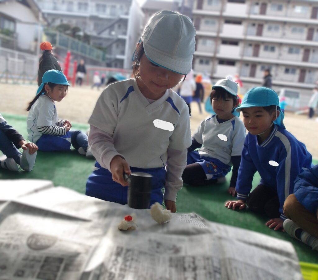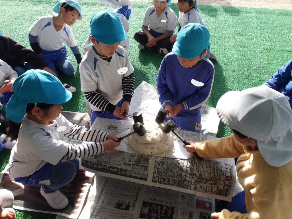 鏡もちをトンカチで開いていくと、「これで元気に過ごせるね!」と話していた子どもたち。お餅はとっても固く力がいりましたが、みんなで全ての鏡開きをすることができました。