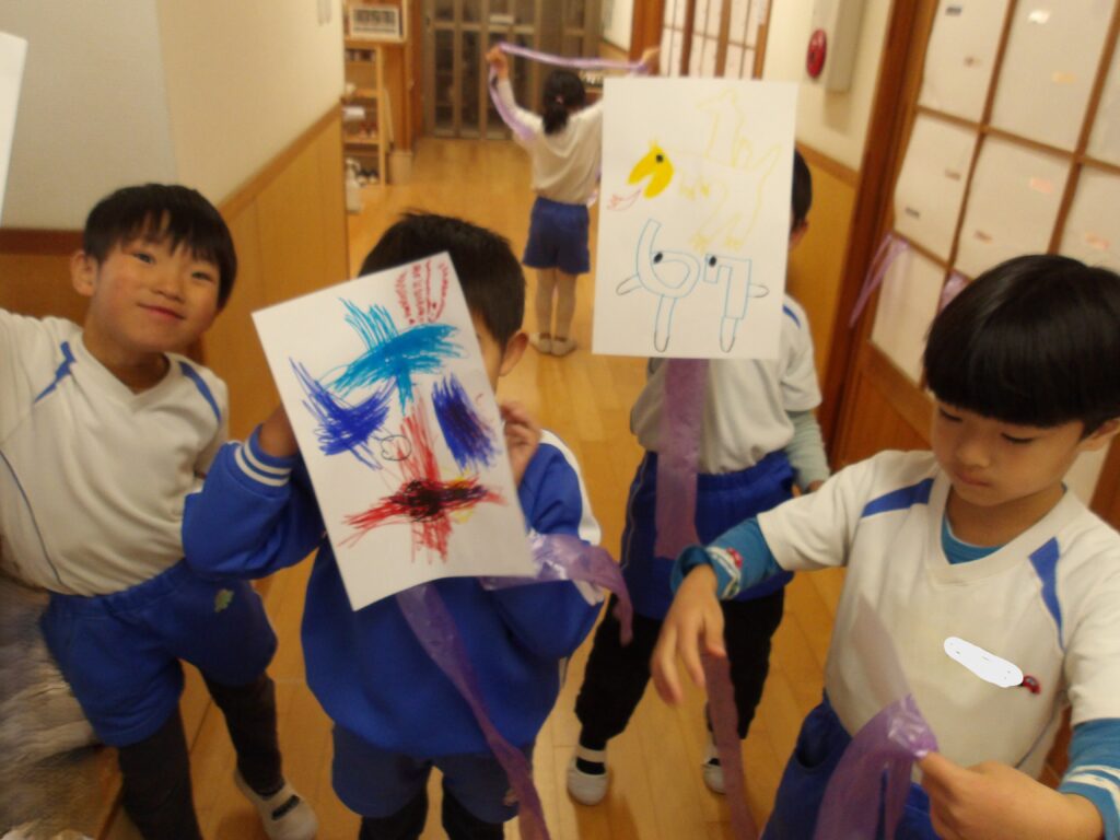 好きな絵を描いて作った凧は、とても可愛く仕上がりましたよ。風が吹くと浮かび上がる凧に子どもたちも大喜びでした!