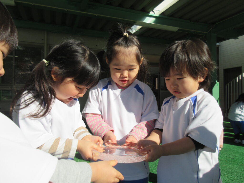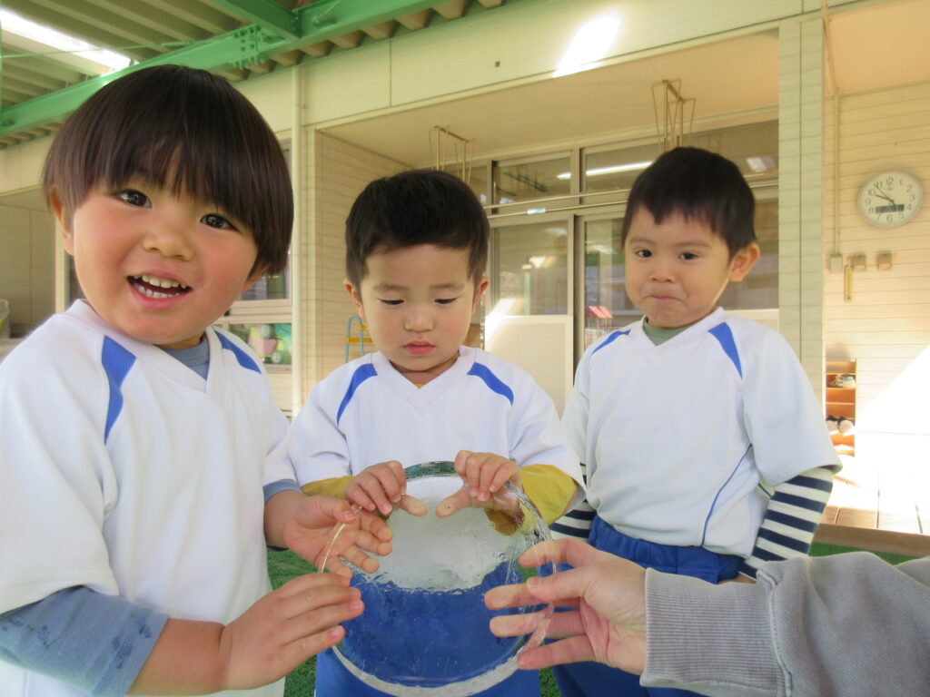 氷遊び~うさぎ組~ 2026年2月17日 最終更新日時 : 2026年2月17日 yashiro バケツに水を入れて、氷作りをしました。1回目は薄い氷でしたが、2回目は大成功!!「つめた~い」と言いながらも、大興奮の子どもたちでした。