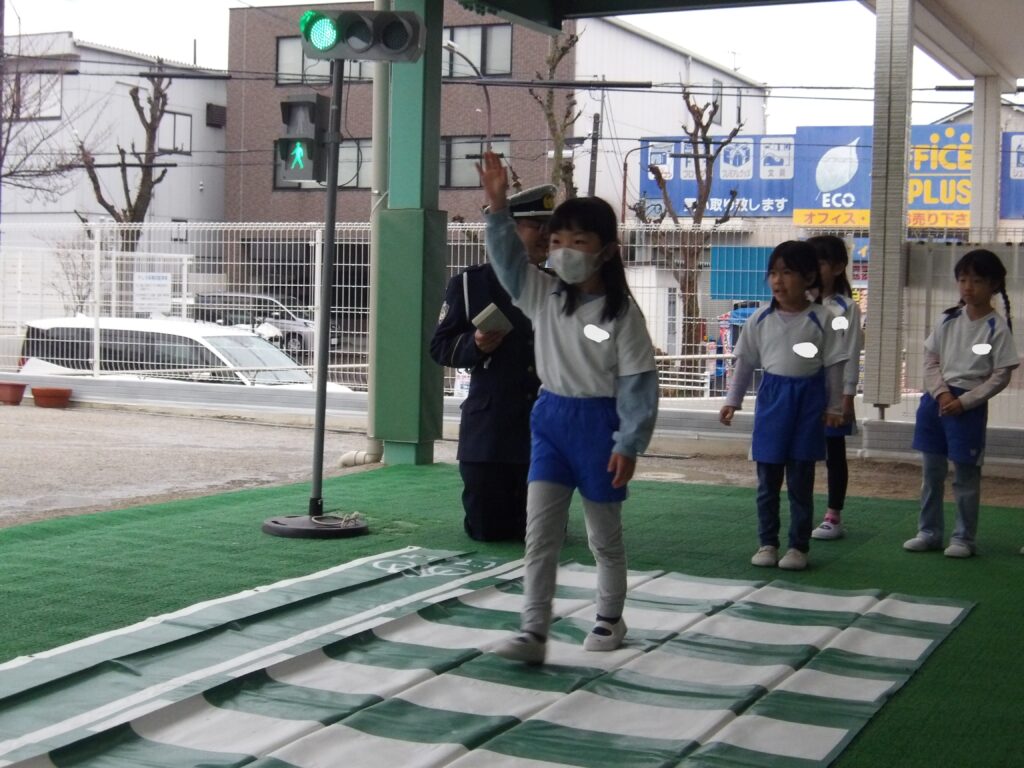 交通ルールの紙芝居を見せていただき、教えていただいた合言葉は「とまと」です。「とび出さない」「まわりをよく見て右左」「とまる」。この3つを守って、用意していただいた信号機と横断歩道を使って実際に渡ってみましたよ。少しドキドキしている様子の子どもたちでしたが、しっかり右左を確認したり、手を挙げたりして渡ることができました!