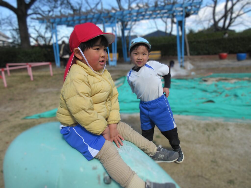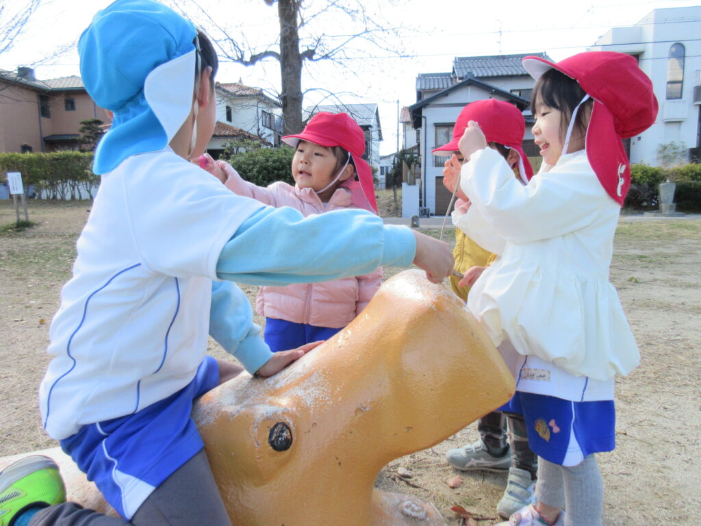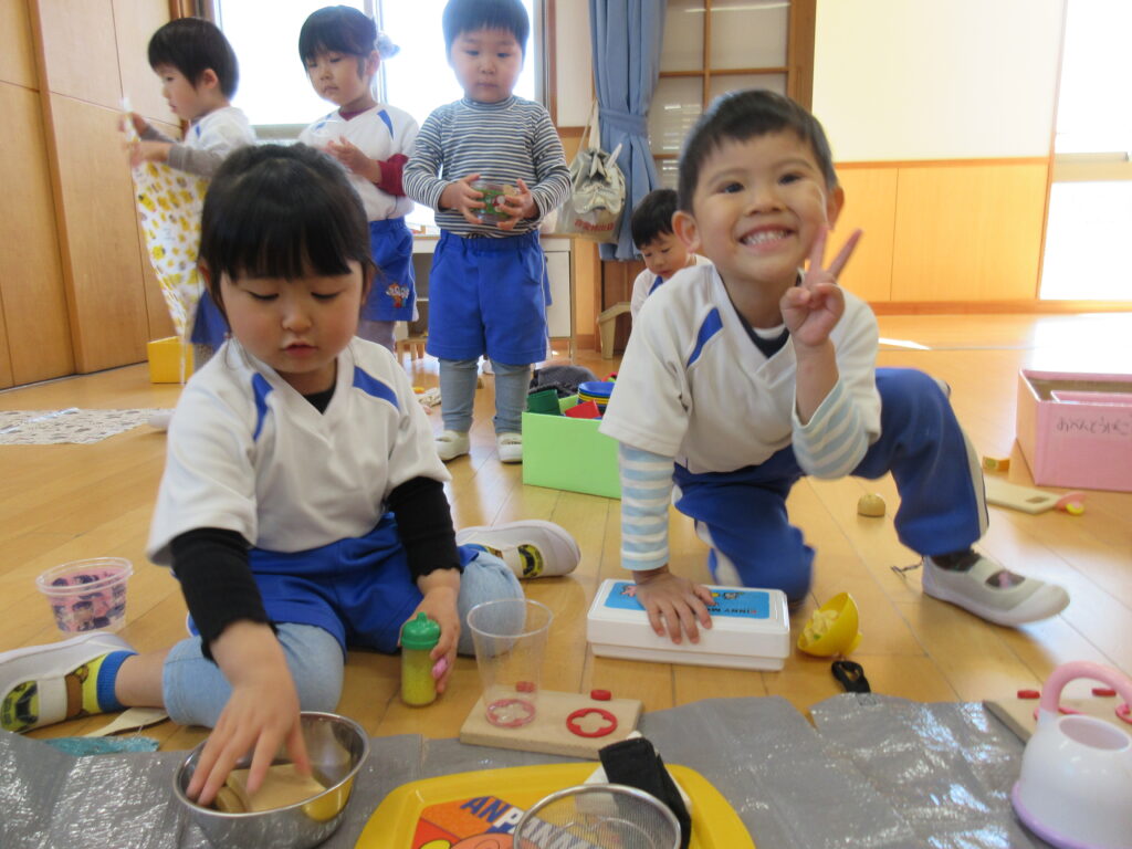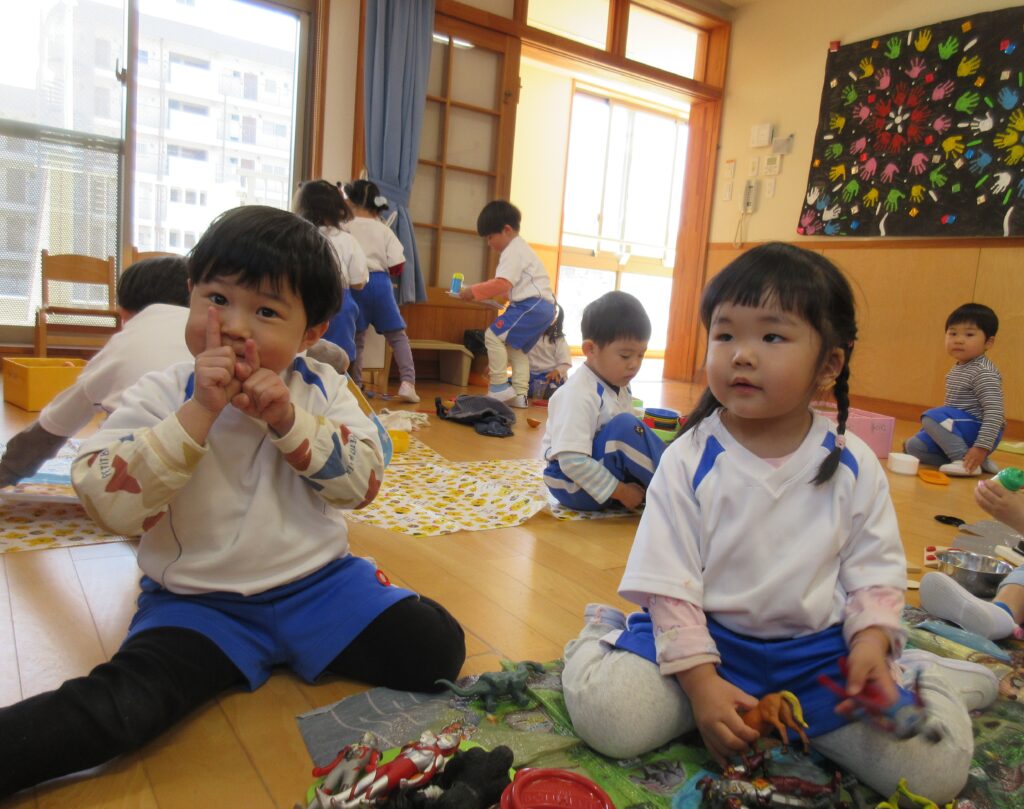 初めてぱんだ組のお部屋に遊びに行きました。うさぎ組にはないおもちゃに興味津々の子どもたち。「4月からぱんだ組さん!」と張り切っています。
