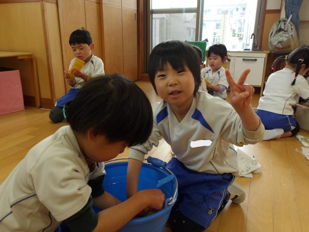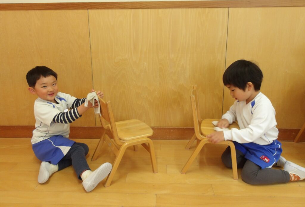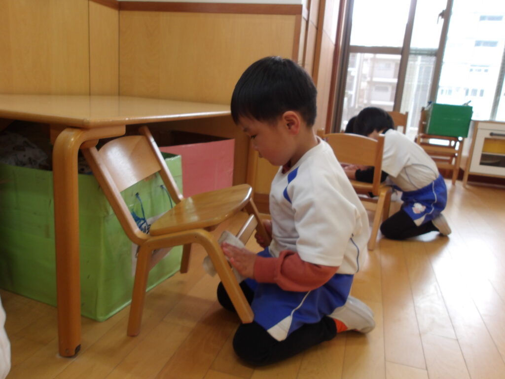 ぱんだ組での生活もあと少し。1年間使用したロッカーやお道具箱の中、イス等の大掃除をしました。