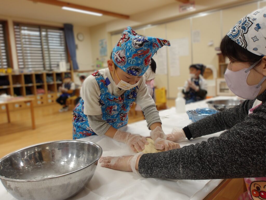 パン作りでは、作り方を見ながら一生懸命にこねたり、伸ばしたり、丸めたりと順番に行いながら、生地作りをしましたよ。