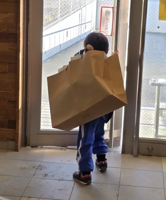 大きな袋を一生懸命持っています。