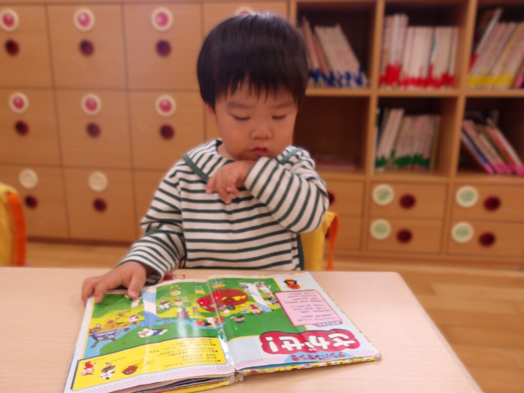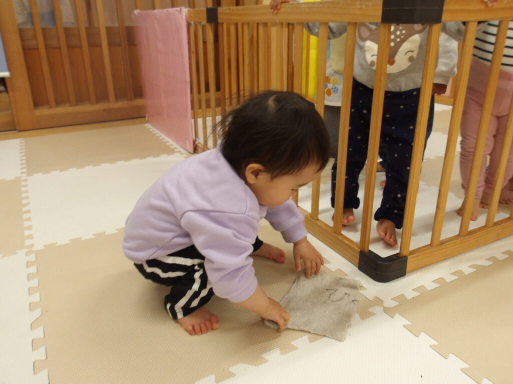 また、1歳児さんはうさぎ組の部屋へ遊びに行きました。見慣れない玩具やお部屋に少し緊張モードでしたが、遊び始めるとにっこり笑顔で楽しんでいた子どもたちです。