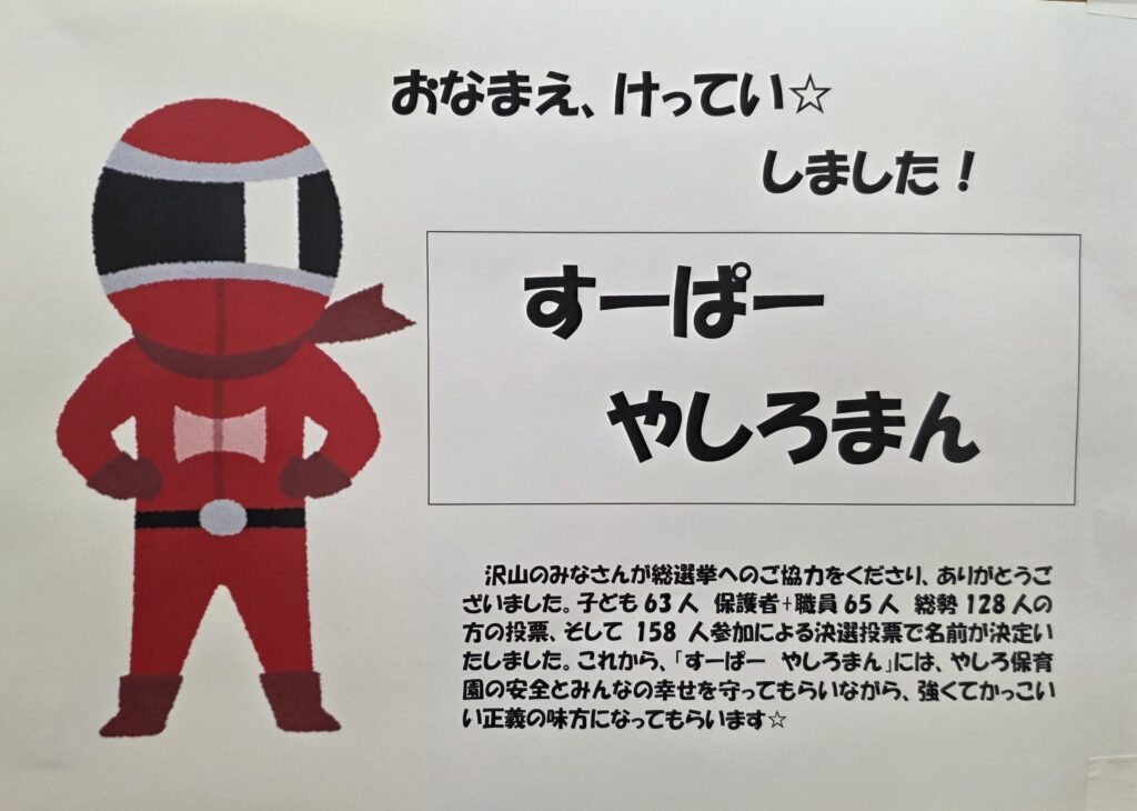 やしろ保育園のみんなで楽しむ『やしろほいくえん わくわくうぃーく』も今年で4年目を迎えました。年度末の最後の2週間を子どもたちとより楽しく過ごし、進級や卒園に向けてより期待を持てるように、そして今年は、保育園のみんなとヒーローを作ろうという取り組みと、園内かくれんぼを計画しました。毎日園内では「あった~☆」と嬉しそうな声が広がり答え合わせに大興奮でした。やしろヒーロー計画では、保護者の皆さんにもご協力を頂きまして、お名前の募集からのみんなで総選挙。そして決選投票を経てやしろのヒーローが誕生しました。これから「すーぱーやしろまん」が色んな所で大活躍をしながら、子どもたちと共にまた成長していく姿がとても楽しみです。是非、保護者の皆様も子どもたちと共に「すーぱーやしろまん」の活躍ご期待ください。