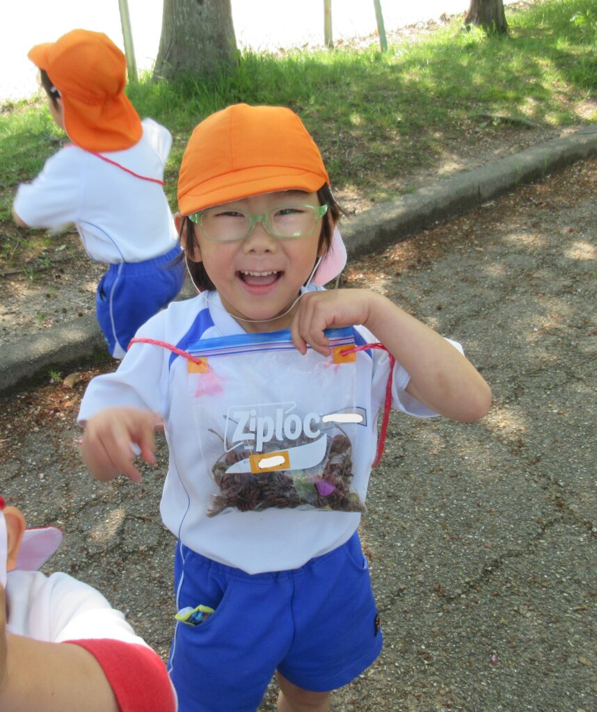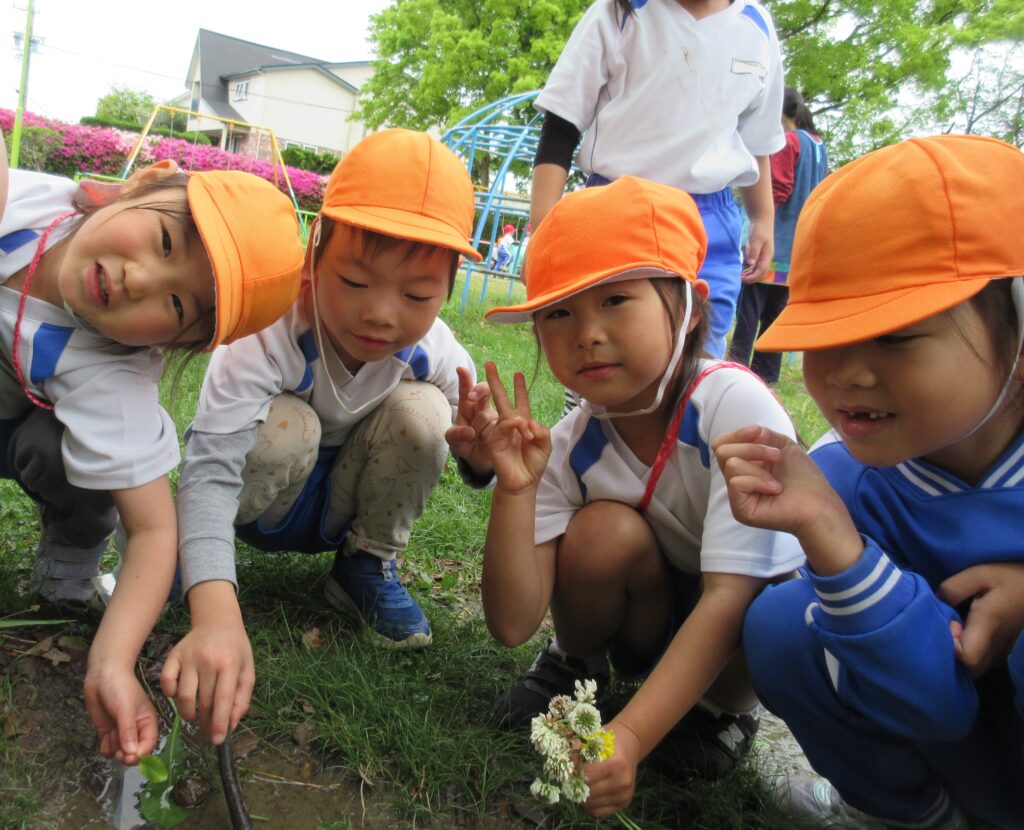 春探しでは、虫や草花を見つけて興味津々の子どもたち。発見したものを見て友だちと話し合いながら観察していました。