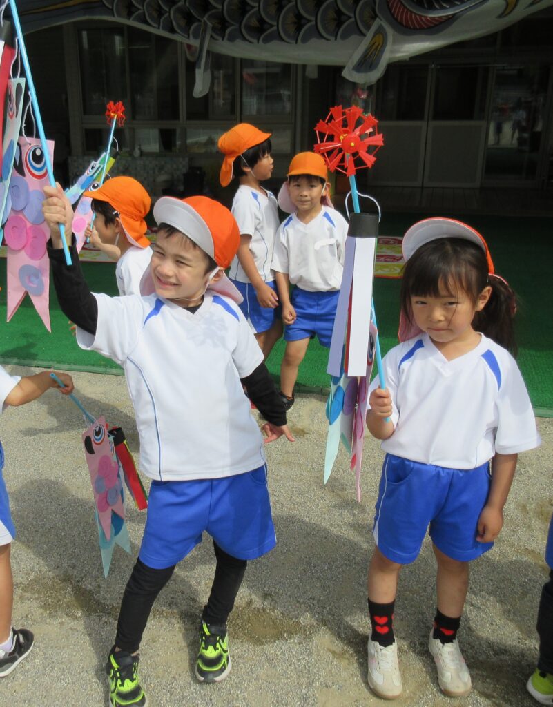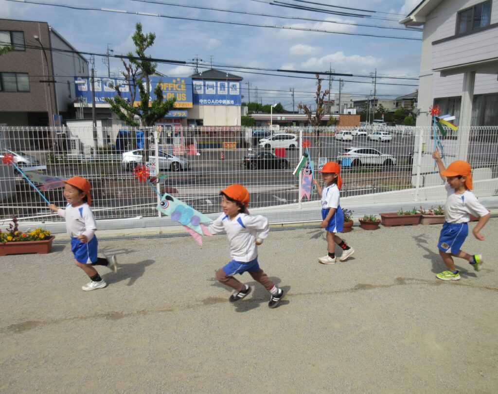 自分たちでハサミで切ったウロコを貼り付けていき、出来上がったこいのぼりを園庭で泳がせました。元気いっぱいに走り回り、泳ぐ様子を見て喜んでいました。