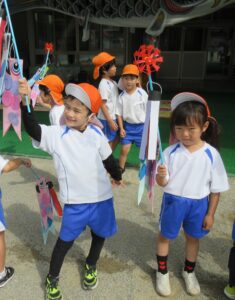 水遊びでは氷や寒天に触れ、それぞれの感触を楽しんでいました。遊んでいくうちに小さくなっていく氷や寒天を見て不思議そうにしていました。洗濯ばさみを用いて指先を使う遊びを楽しんでいます。台所に挟んで動物のツノやケーキのろうそ […]