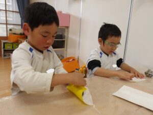初めて自分の絵の具を使って、制作をしました。「どんな味のジュースが飲んでみたいかな?」という先生からの問いかけに、「オレンジジュース!」「カルピスがいいな~」と言いながら、色を決めていた子どもたち。コップからこぼれないよ […]