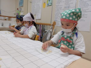 机上で集中して取り組めるようになってきたうさぎ組さん。粘土ベラを使い、切ったり伸ばしたり丸めたり・・・。真剣な表情に、「なにができるかな?」と保育者が声を掛けると「せんせいできたー!」「みてみて~」と作った物を見せてくれ […]