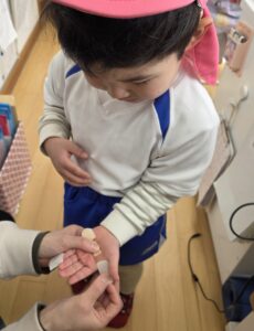 室内でかみなりゲームという集団遊びをしました。先生が「か」から始まる言葉を言い、それをよく聞いて「かみなり」と言われた時だけ仰向けからうつ伏せになっておへそを隠すというルールです。子どもたちは「か…か…か…かめ!」「か… […]